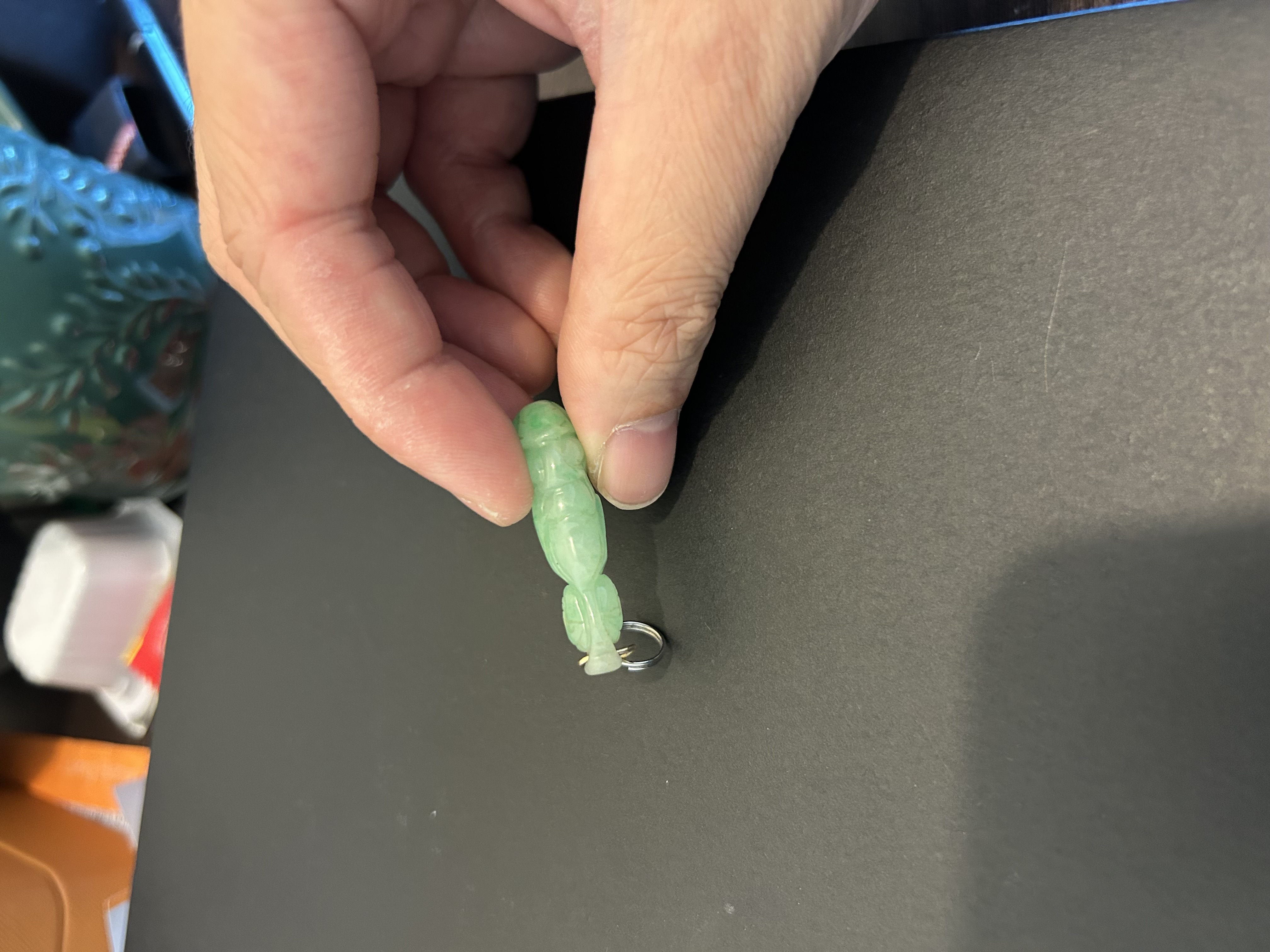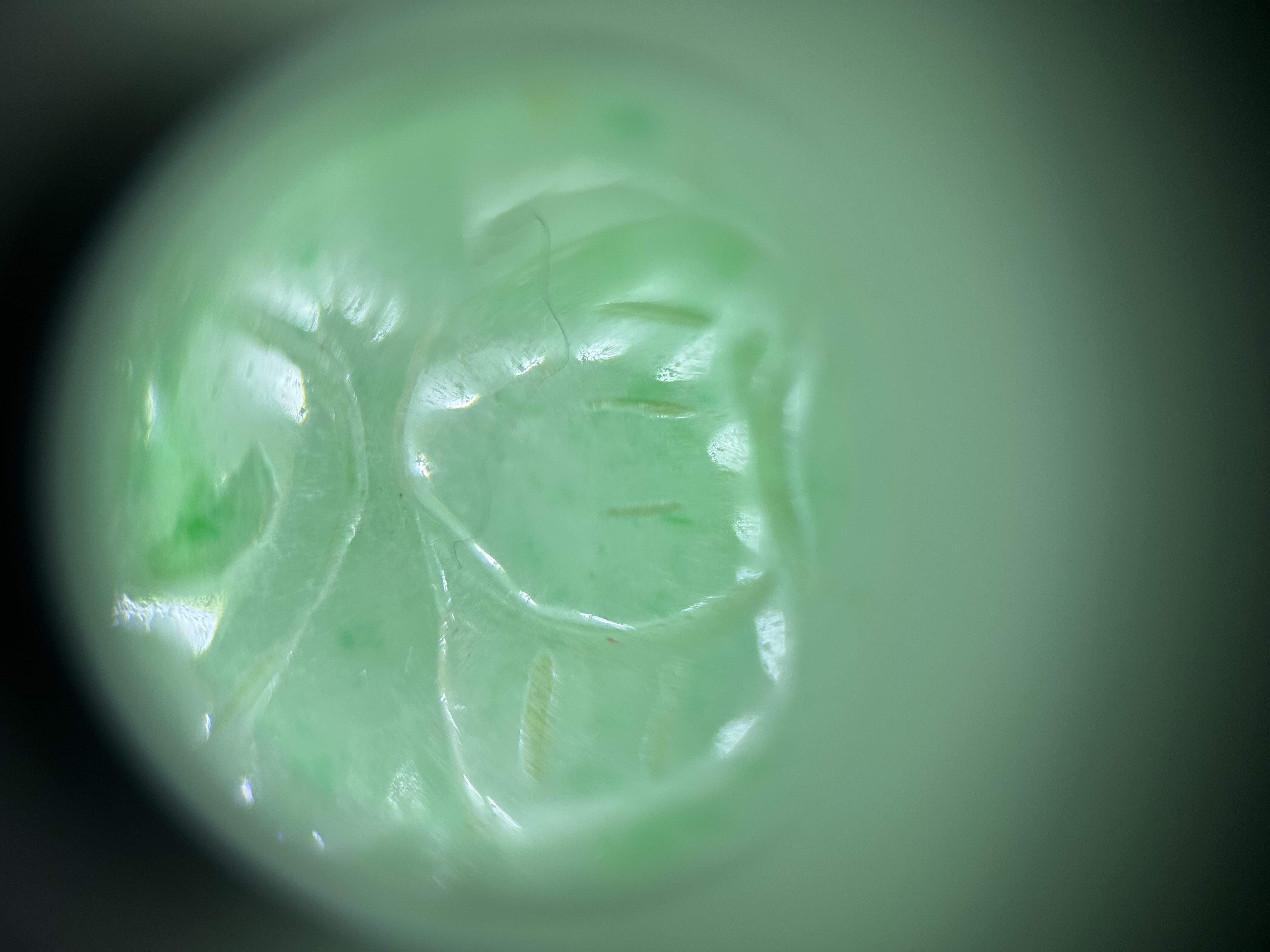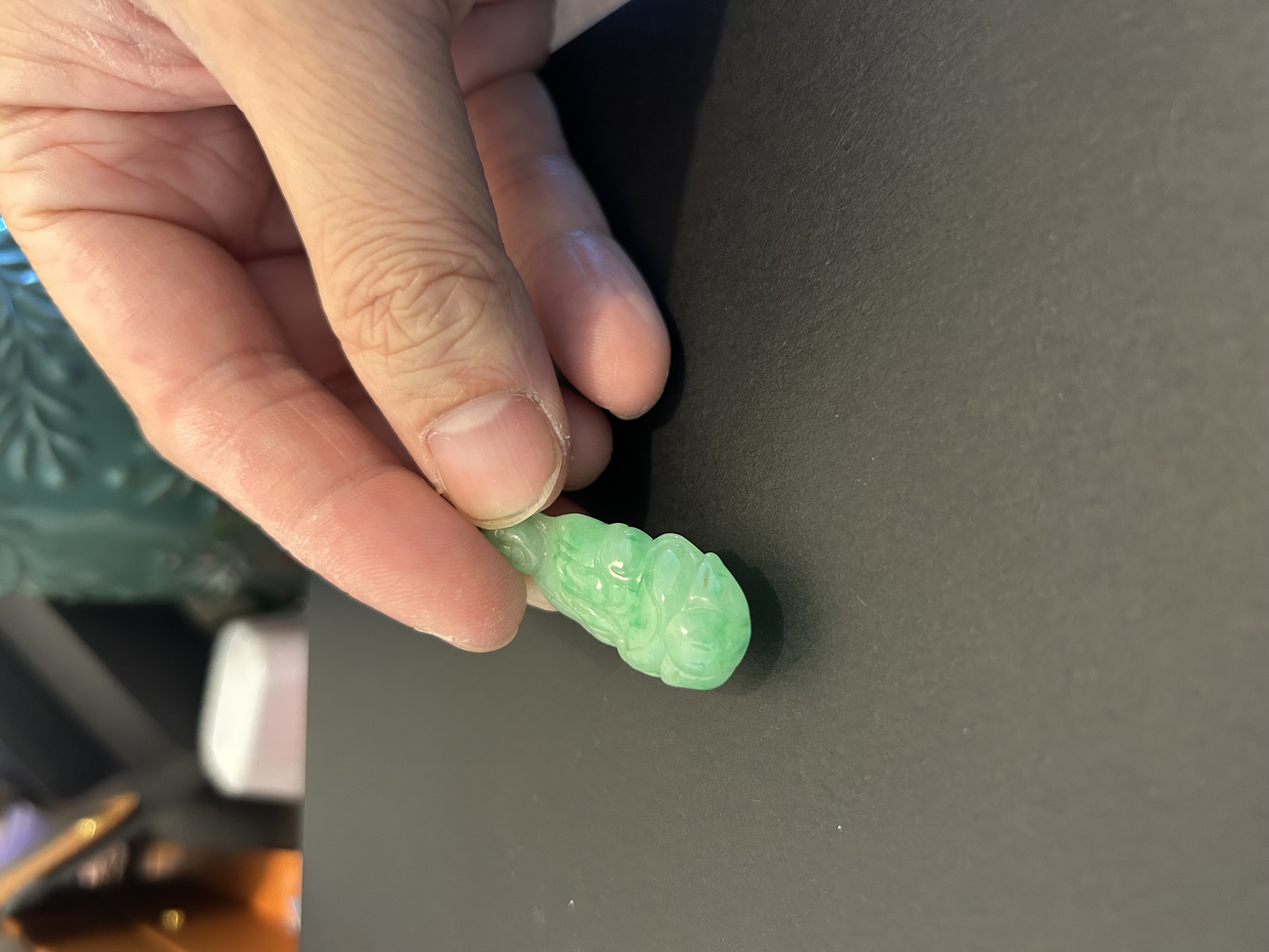 此件为民国时期天然翡翠A货吊坠,玉质细腻,色泽呈自然的淡绿,质地温润且具天然翡翠的矿物特征,无人工处理痕迹。雕刻工艺朴拙,线条简洁,符合民国时期民间翡翠雕件的风格特点。表面飞砂痕迹较50-60年代玉件更明显,是其年代特征的佐证,整体符合清末民初翡翠雕件的工艺与材质特征。 鼻烟壶狮纹雕刻,凸起部分的开脸、鬃毛刻画更具古韵,线条粗犷且流畅,细节处的刀工转折自然,无现代机械雕刻的生硬感。 给您点建议,去收藏精品,例如鼻烟壶这样的精品,这种小翡翠吊坠,如果是以前的藏品就留着吧,如果是没买的,不建议收藏太多,太小了,不成器,升值空间无限。