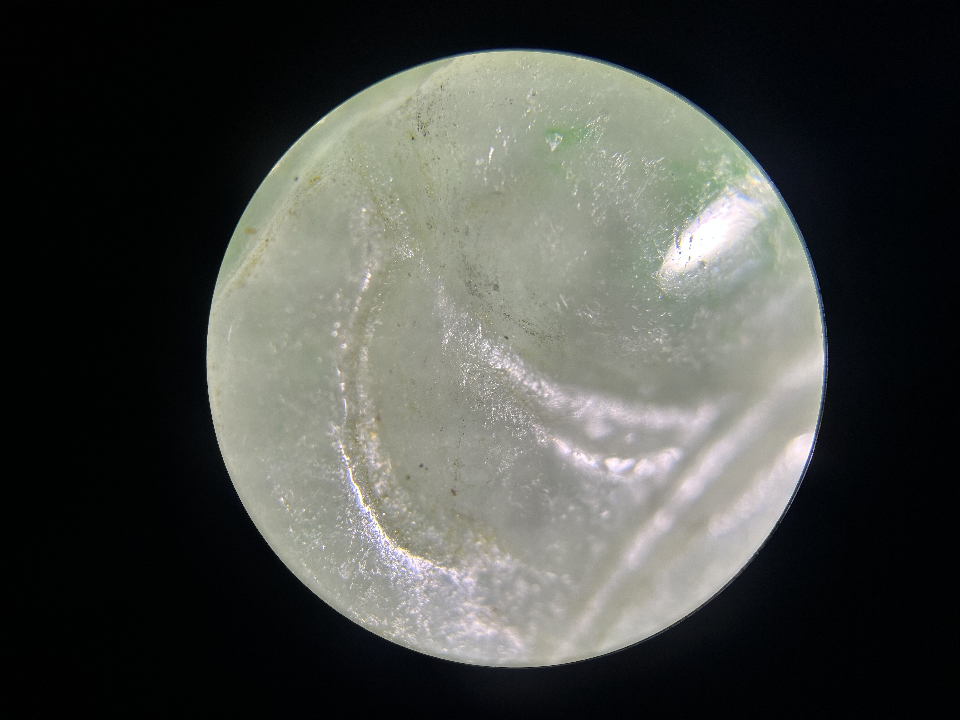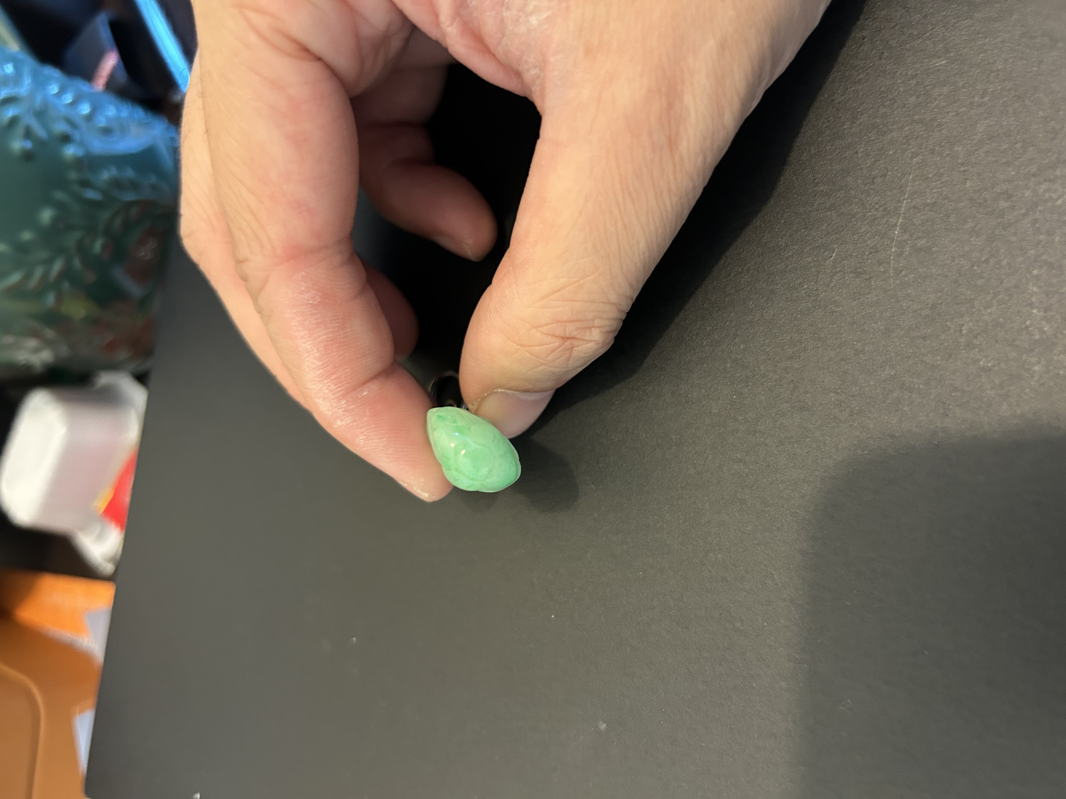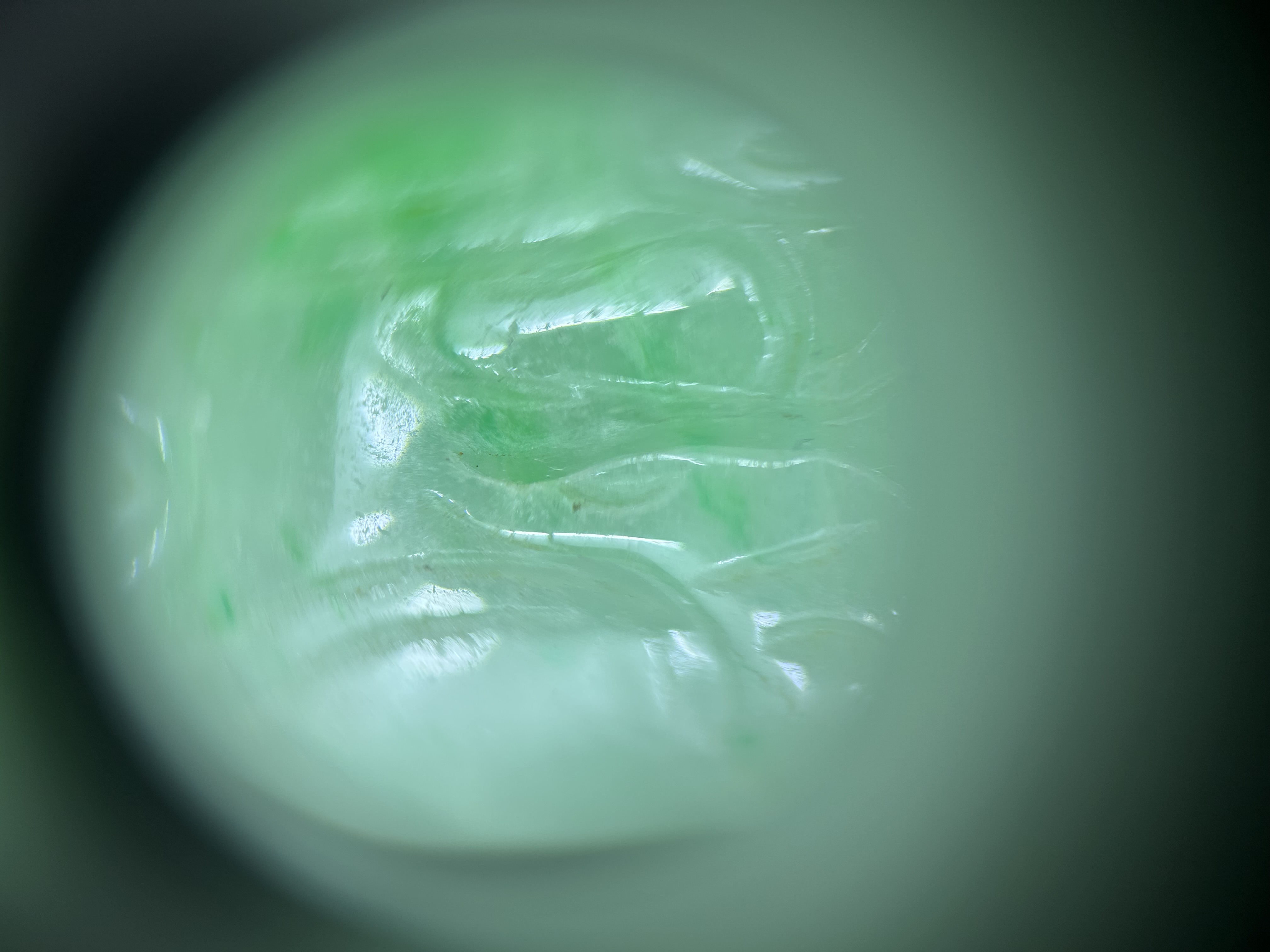 此件为民国时期天然翡翠A货吊坠,玉质细腻,色泽呈自然的淡绿,质地温润且具天然翡翠的矿物特征,无人工处理痕迹。雕刻工艺朴拙,线条简洁,符合民国时期民间翡翠雕件的风格特点。表面飞砂痕迹较50-60年代玉件更明显,是其年代特征的佐证,整体符合清末民初翡翠雕件的工艺与材质特征。 鼻烟壶狮纹雕刻,凸起部分的开脸、鬃毛刻画更具古韵,线条粗犷且流畅,细节处的刀工转折自然,无现代机械雕刻的生硬感。 给您点建议,去收藏精品,例如鼻烟壶这样的精品,这种小翡翠吊坠,如果是以前的藏品就留着吧,如果是没买的,不建议收藏太多,太小了,不成器,升值空间无限。