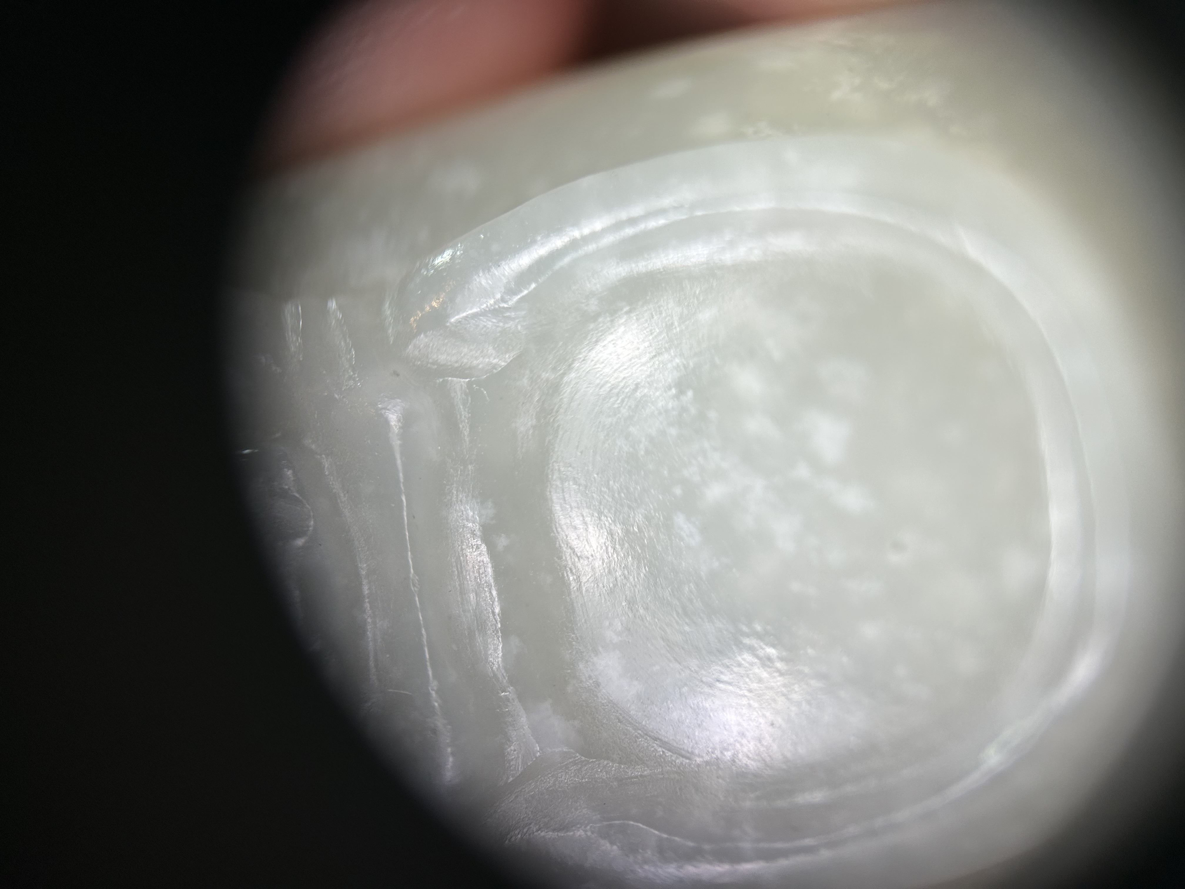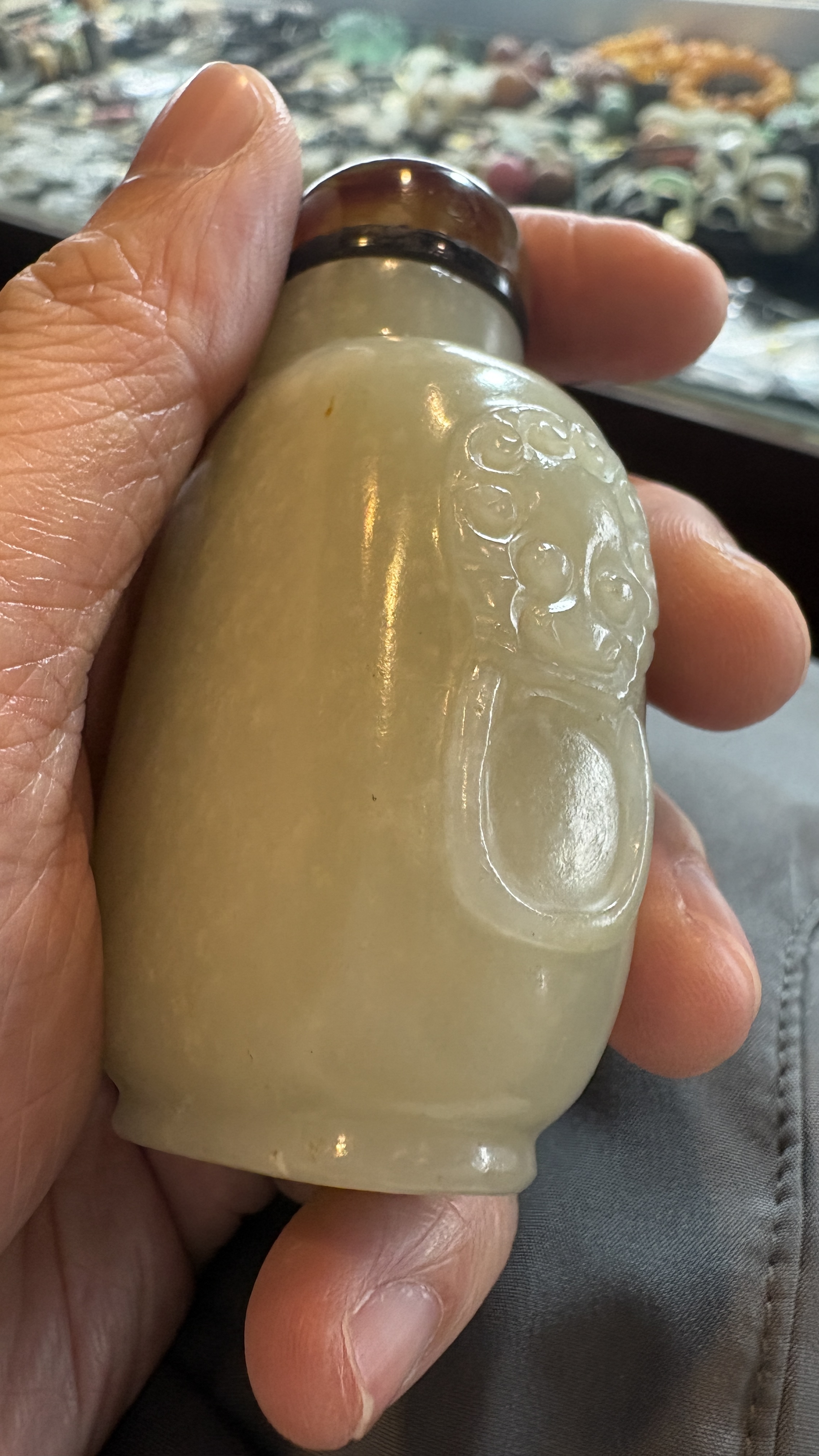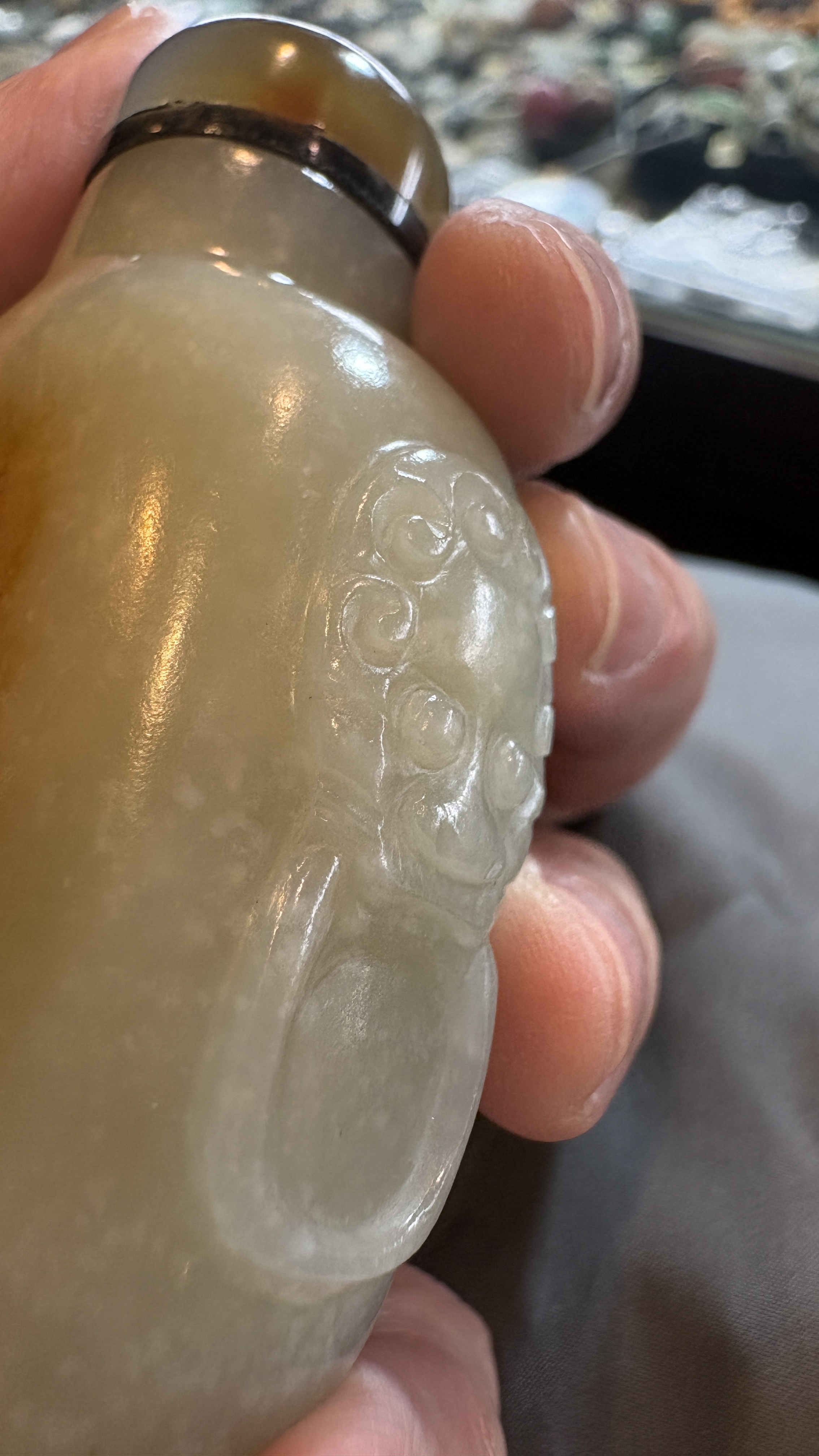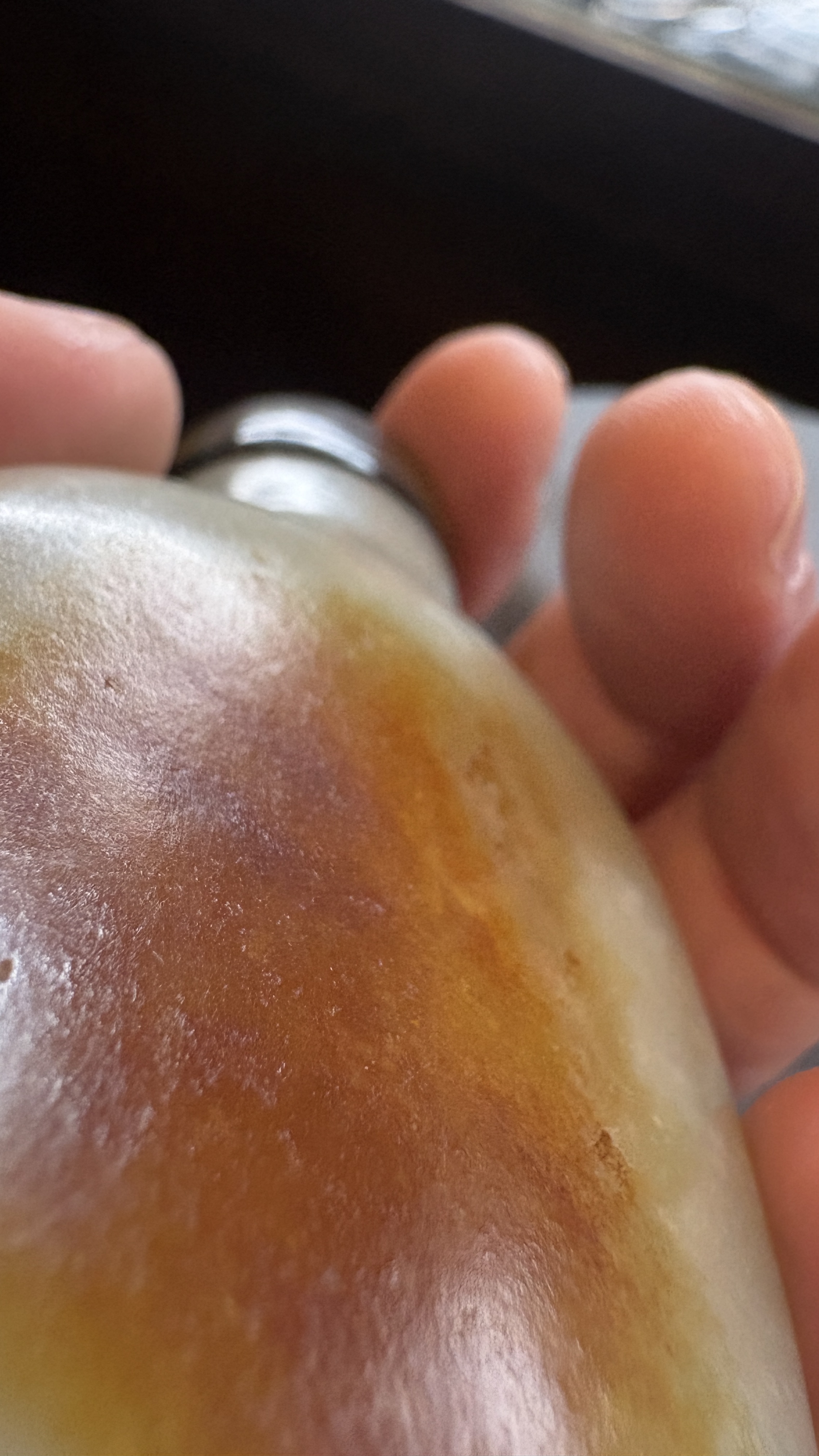 藏友你好,从你拍的图能看到这件玉鼻烟壶的玉料棉感偏重,带皮色的料子玉肉质地稍弱是常见情况,不用在意。你感受到的胶腊感和油润度是和田玉的典型特征,和翡翠的水润质感本就不同,并非注胶或注腊的问题。刻工的工痕能看出是老工特征,工艺没问题。另外鼻烟壶内部掏膛彻底、玉壁较薄,导热变温速度快也属于正常现象,这类器皿件为了实用都会做薄壁处理,不用顾虑哦。整体可以的,可以放心收藏。