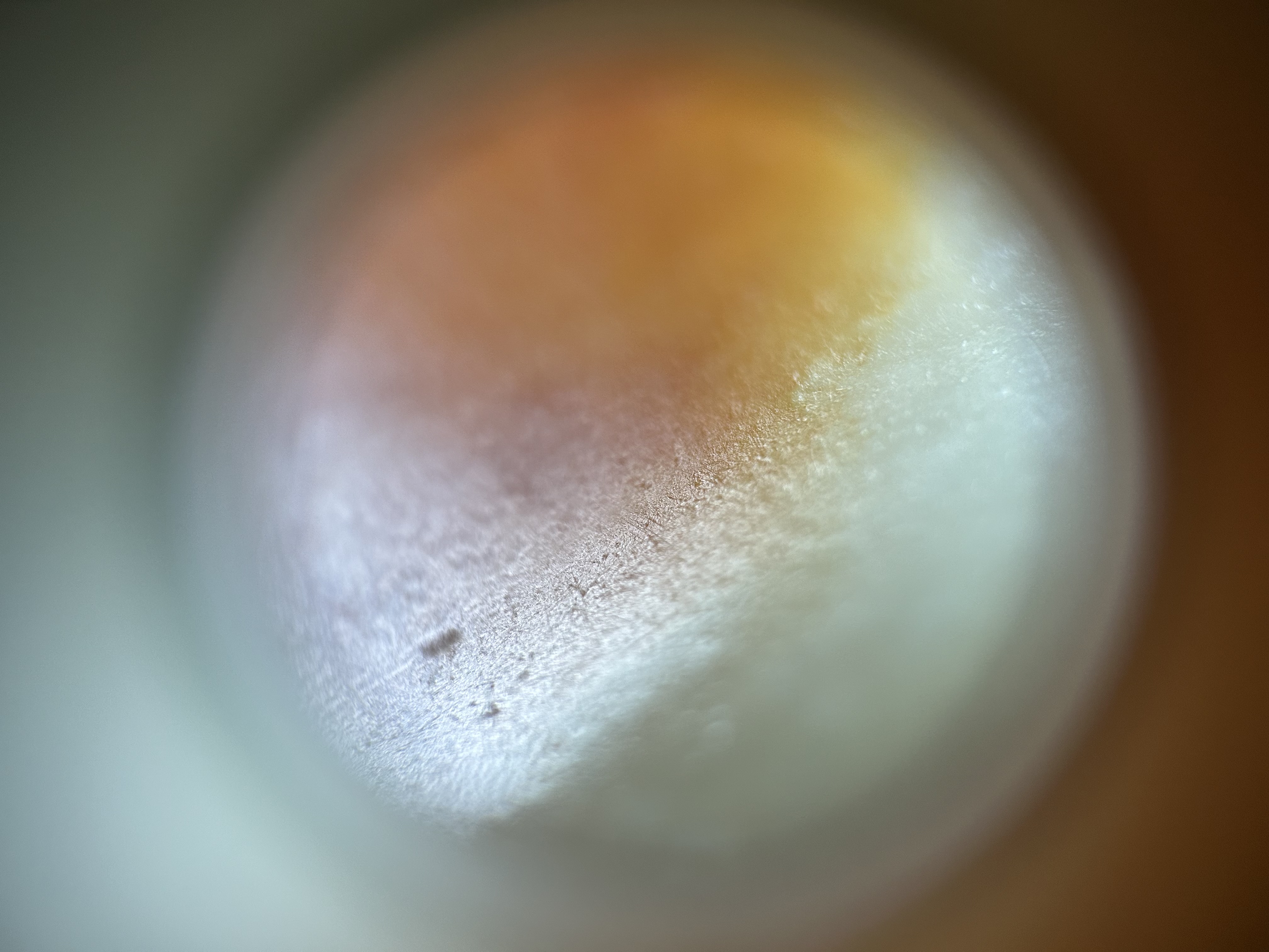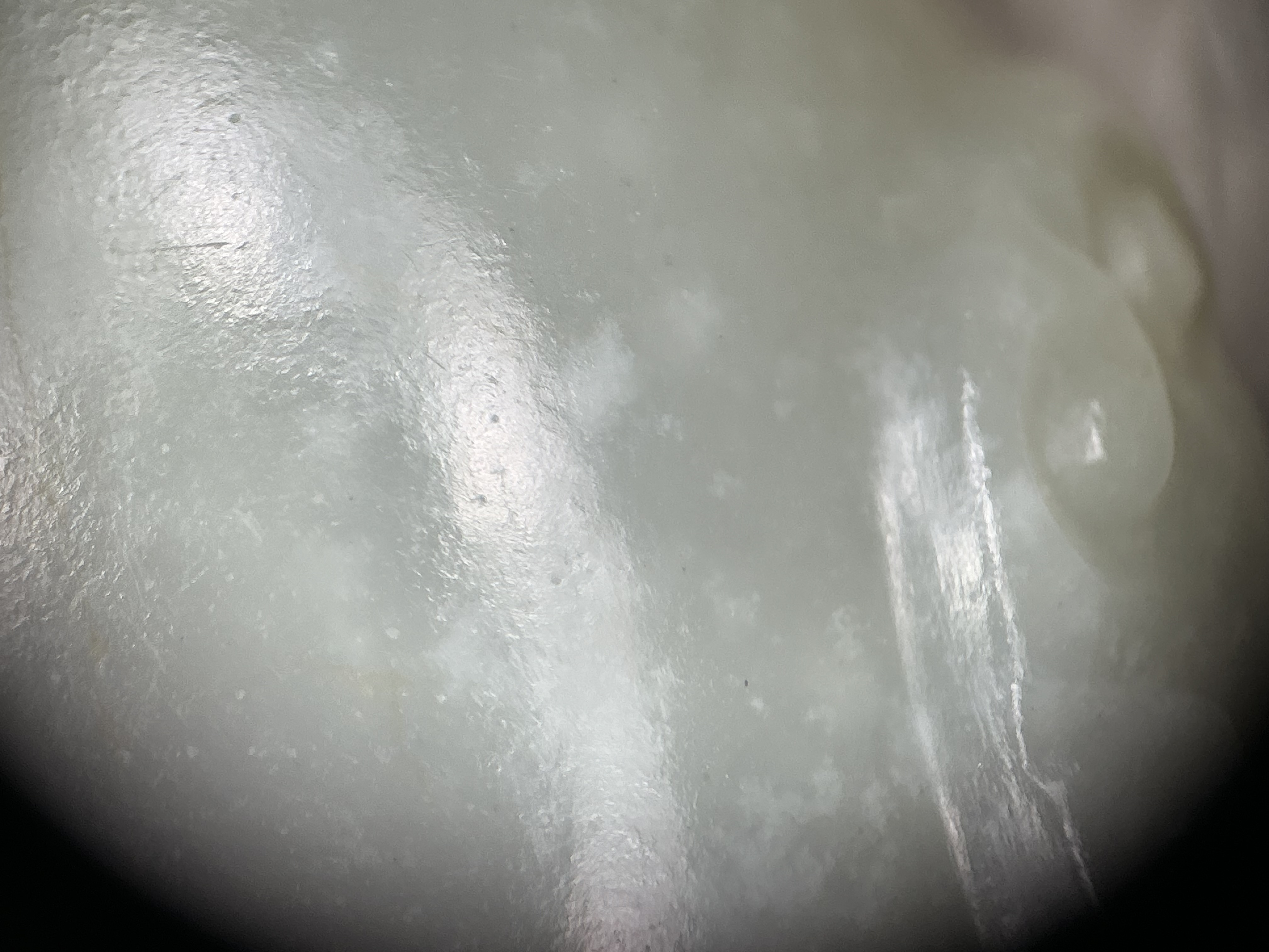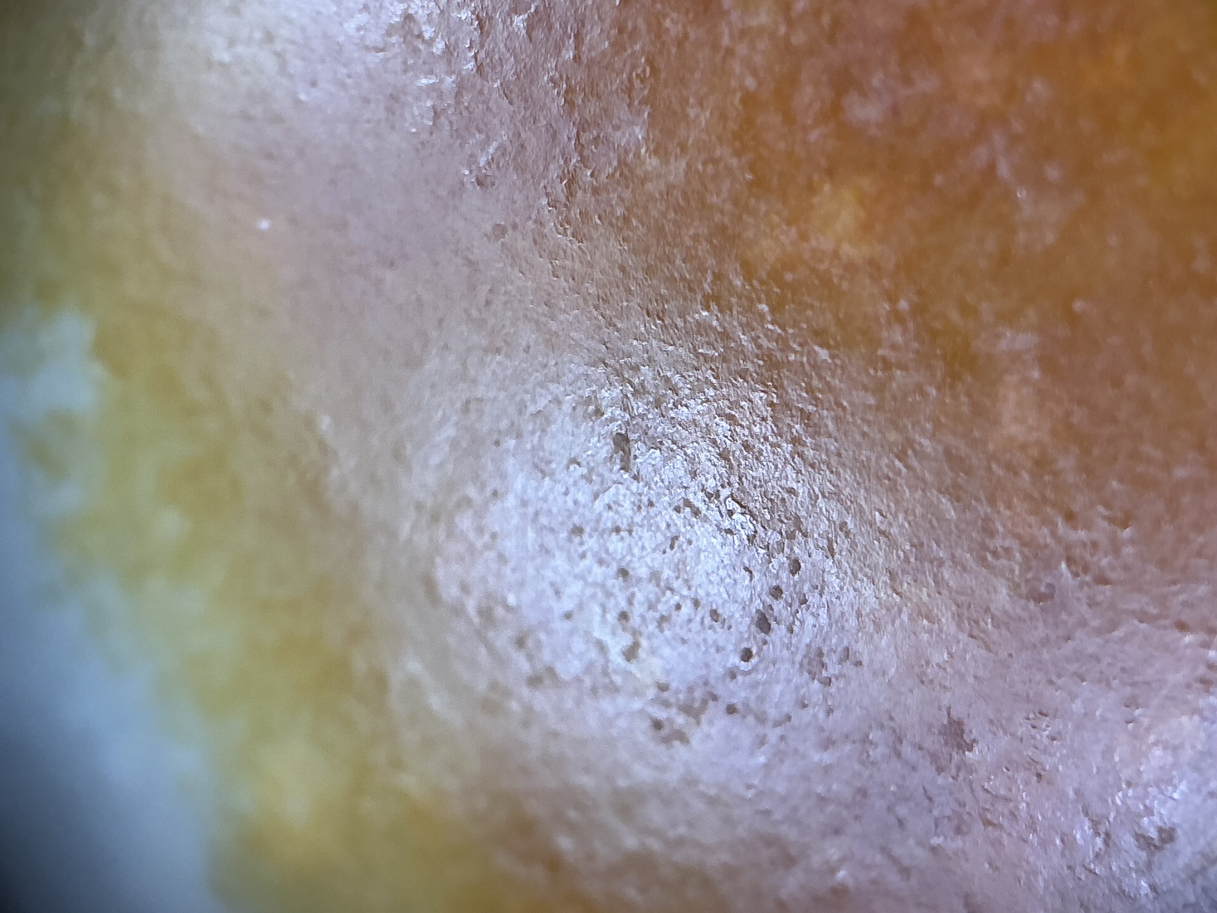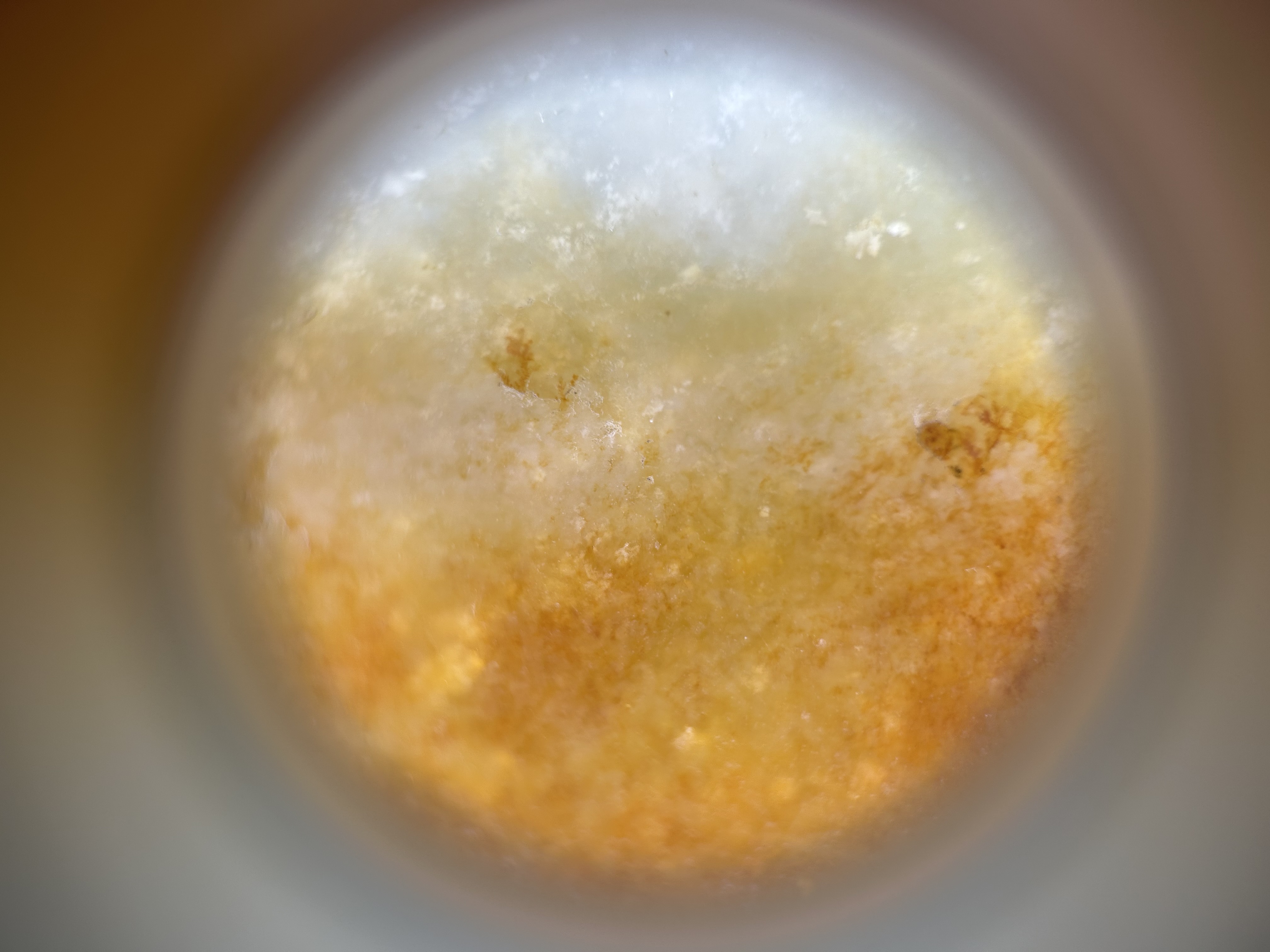 针对你提出的两个核心问题,结合样品天然原皮籽料的特征,解答如下: 1. 皮色属性:这块和田玉的皮色是天然原皮,并非人工上色或后烧色。从细节能看到皮色与玉肉自然渐变晕散,色根深入玉质肌理,且皮色分布贴合籽料的天然毛孔和纹理,没有人工处理仅附着表层、色块生硬的痕迹,是籽料自然形成的皮色特征。 2. 料质类型:该玉料是和田玉籽料,既不是青海料也不是山料。表面放大后能看到籽料特有的细密不规则自然毛孔,内部绵絮呈籽料典型的点状分散状;而青海料的水线多、高透性特征,以及山料松散的絮状结构,在这块玉料上均未体现,网传“多绵就是山料”的说法并不绝对,籽料也会有少量棉点,需结合整体特征判断。