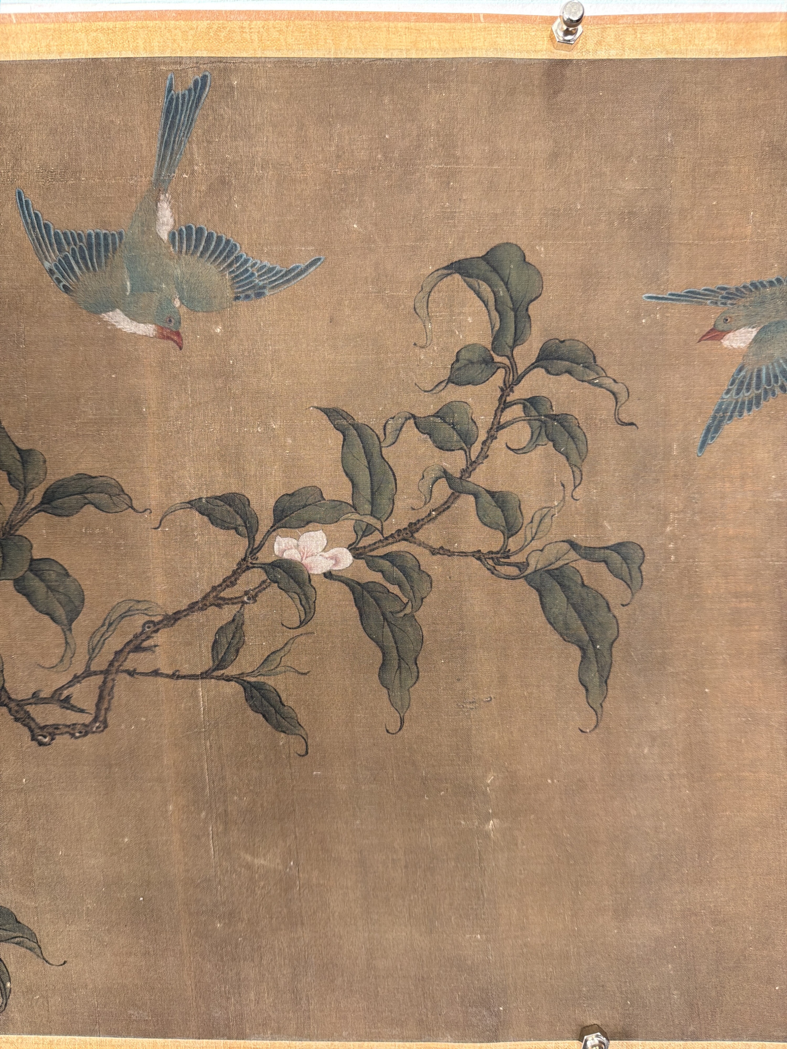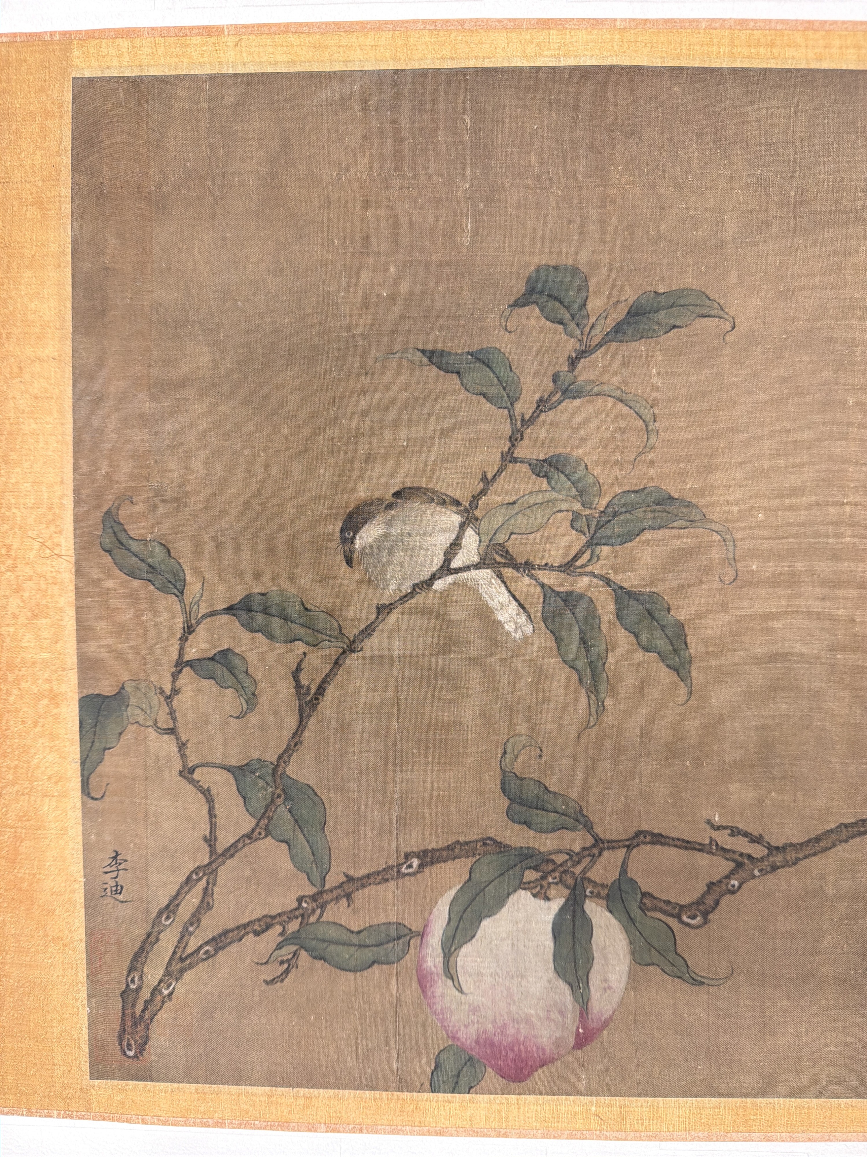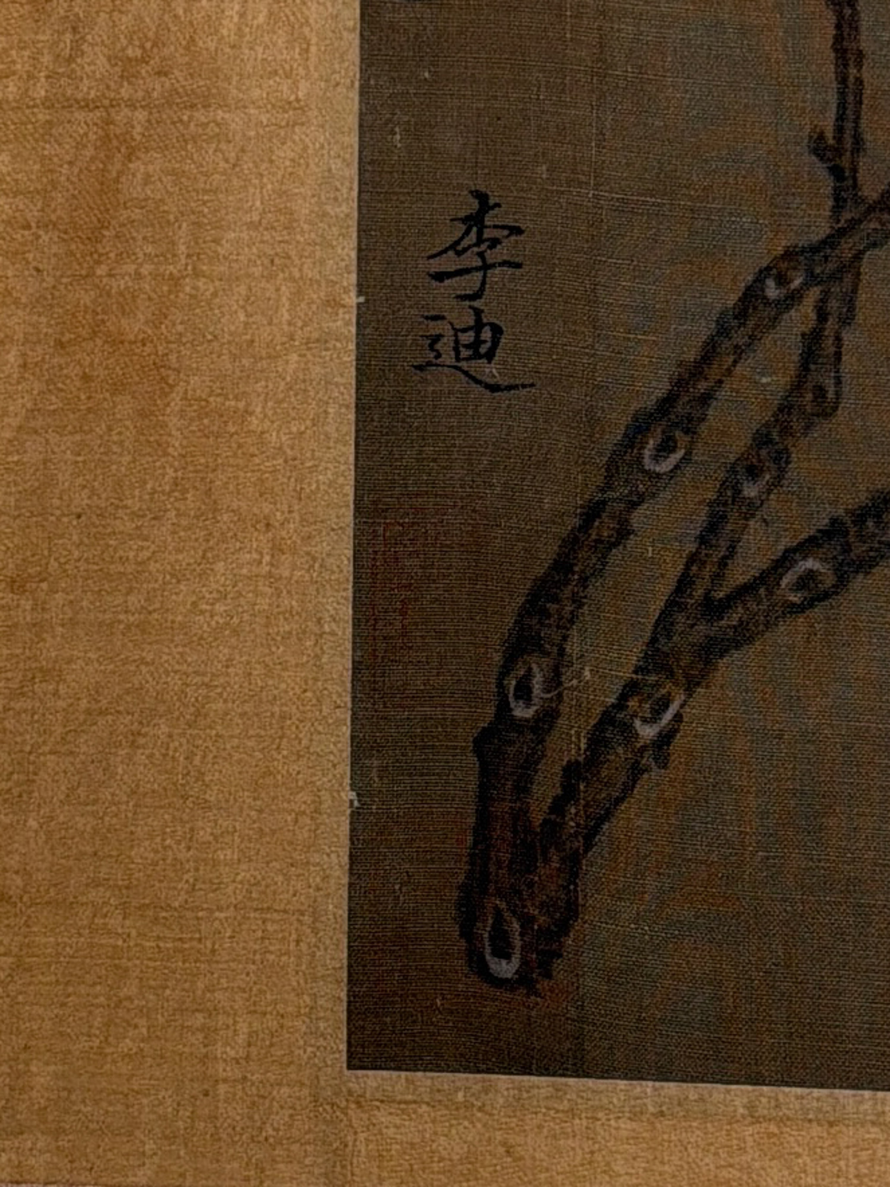 藏友您好!此幅李迪款绢本花鸟,印章不清。李迪是南宋画家,画工虽细,但旧感明显不足,风格上亦有差距,初鉴为赝品,建议谨慎。图片鉴定,仅供参考。感谢您的信任与支持!