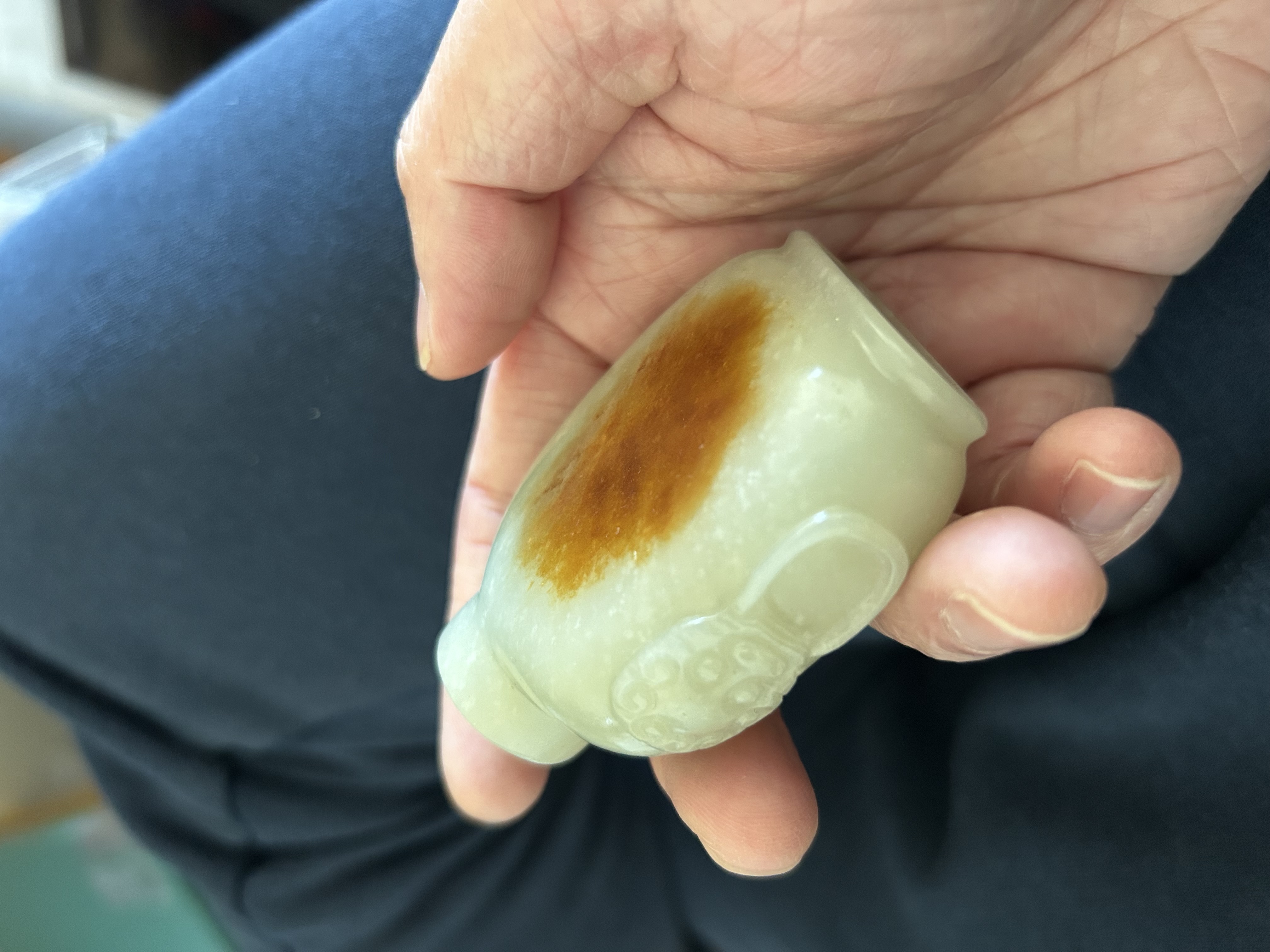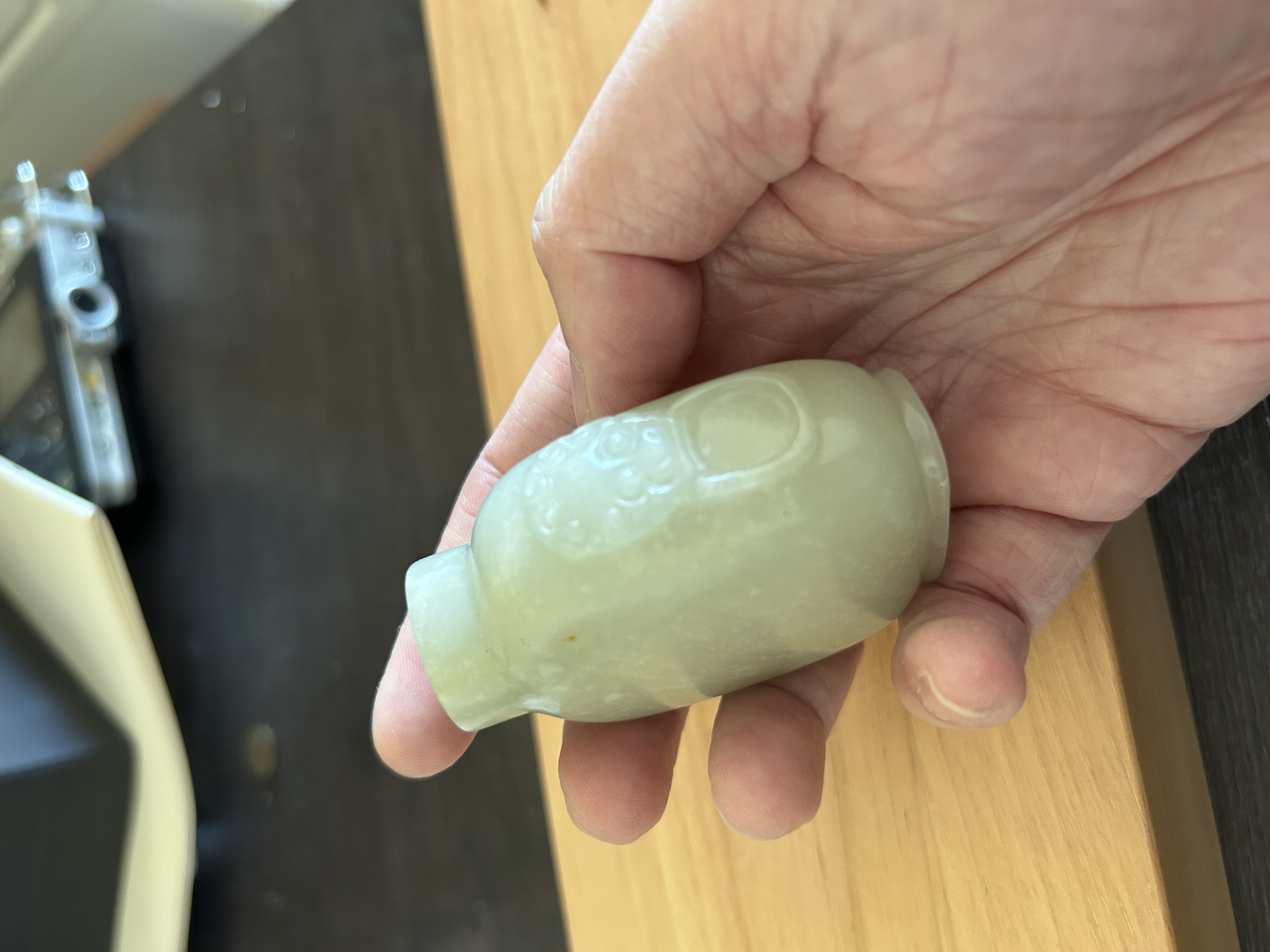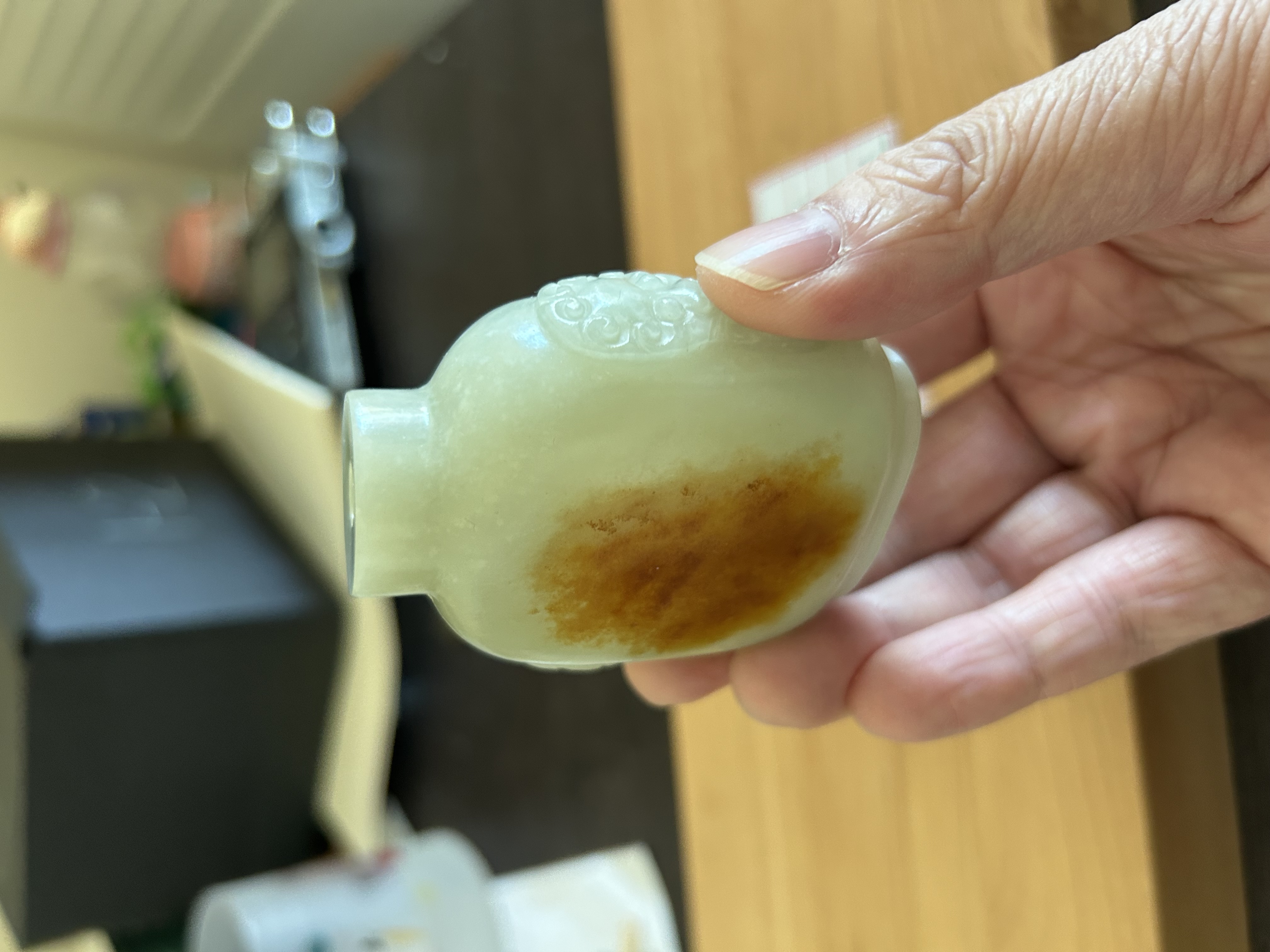 1、鼻烟壶题材不会早过清代,从掏膛、表面砣痕看,应是老工; 2、皮色稍显不自然,有可能是因为拍照的光线条件问题,但怀疑有二次上色的可能,需看实物才能确认。 3、实际上,由于光线问题,整体也很难对玉料的颜色进行判断,实物可能更偏灰青一些。建议下次在白天自然光下拍照(避免夕阳、日出这种偏光环境),这也会极大影响价值判断。 4、“雪花玉”的审美非常见仁见智,不喜者认为是玉料致密度的瑕疵,喜欢者觉得稀世难得,这会对评估造成比较大的困难和波动,比较挑买家。 5、图片没有展示帽和铲,所以不能算作“整器”,对价值评估也会产生负面影响。