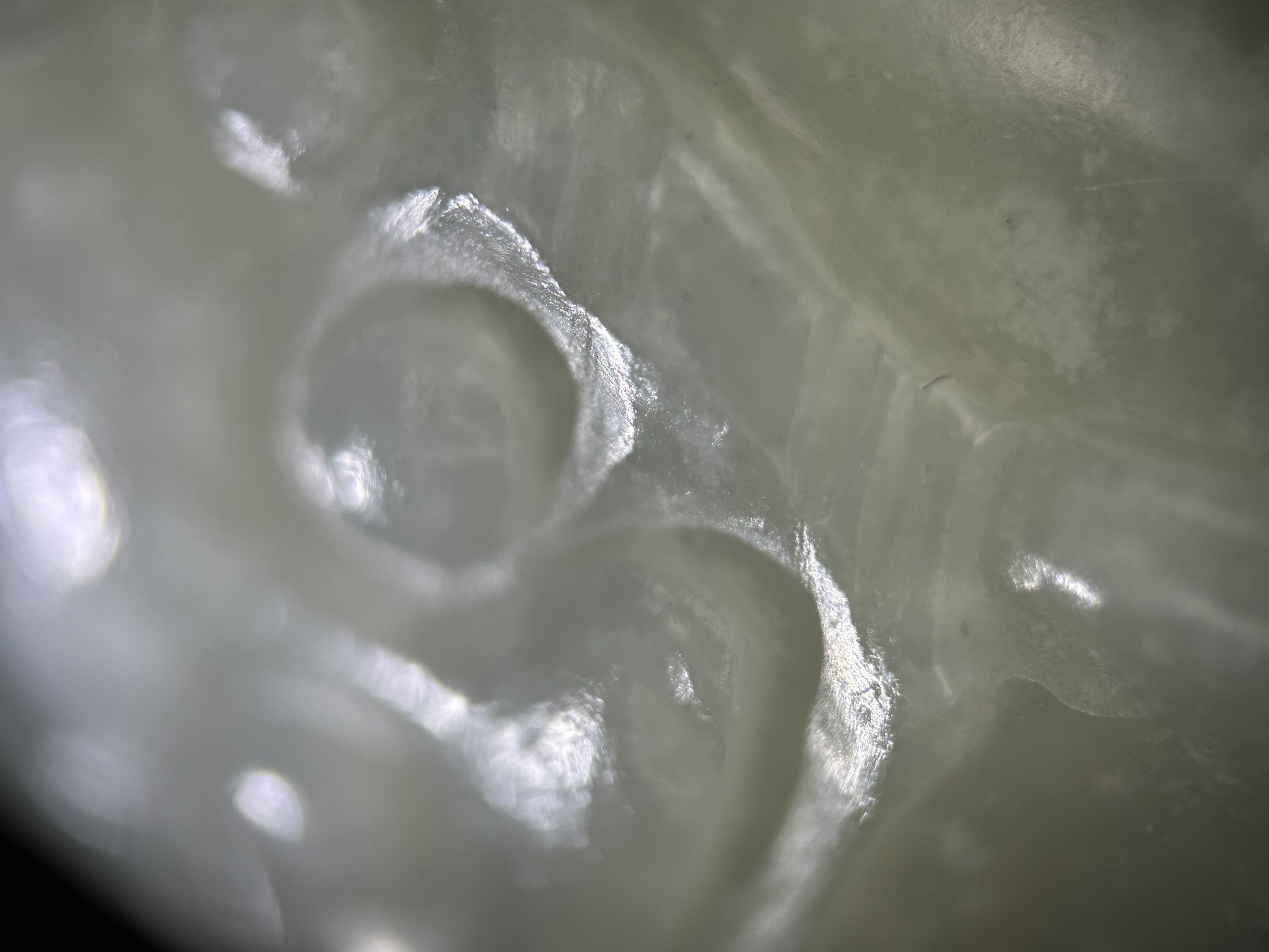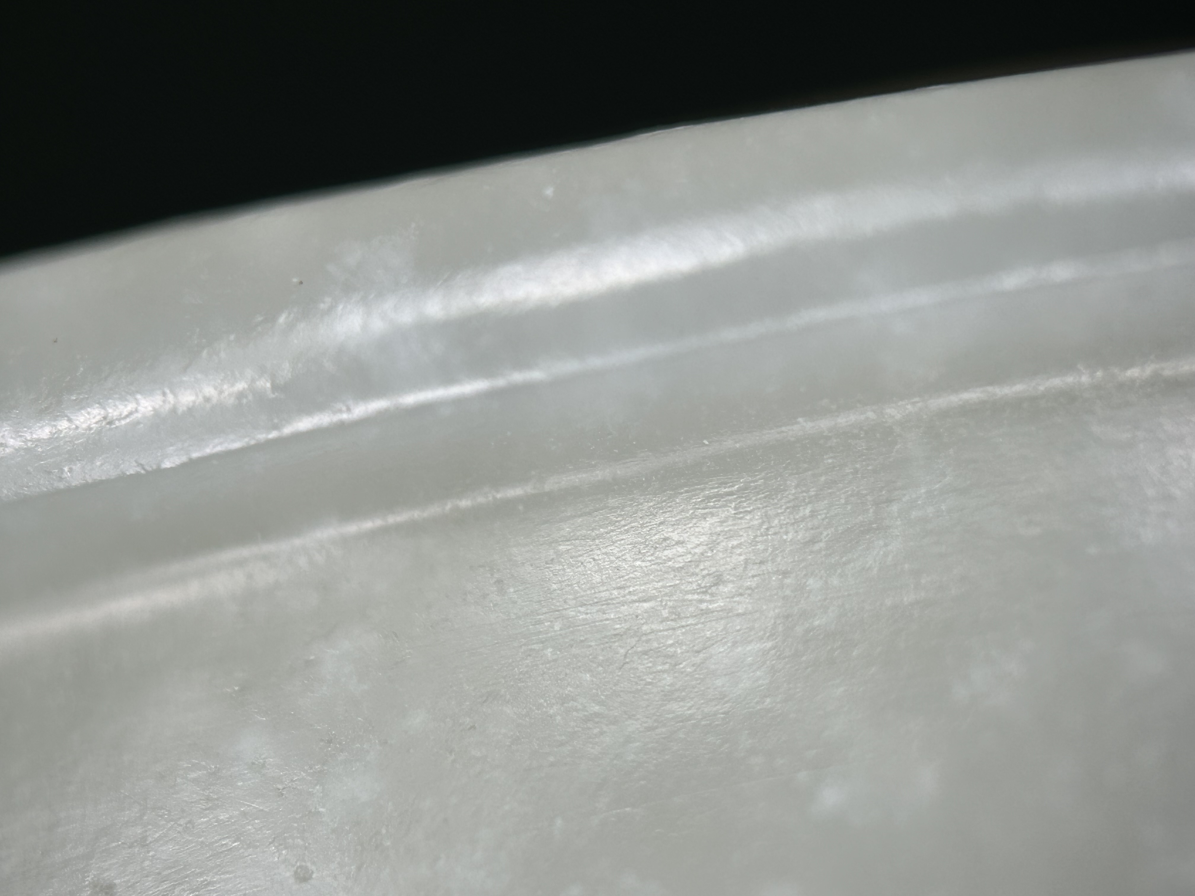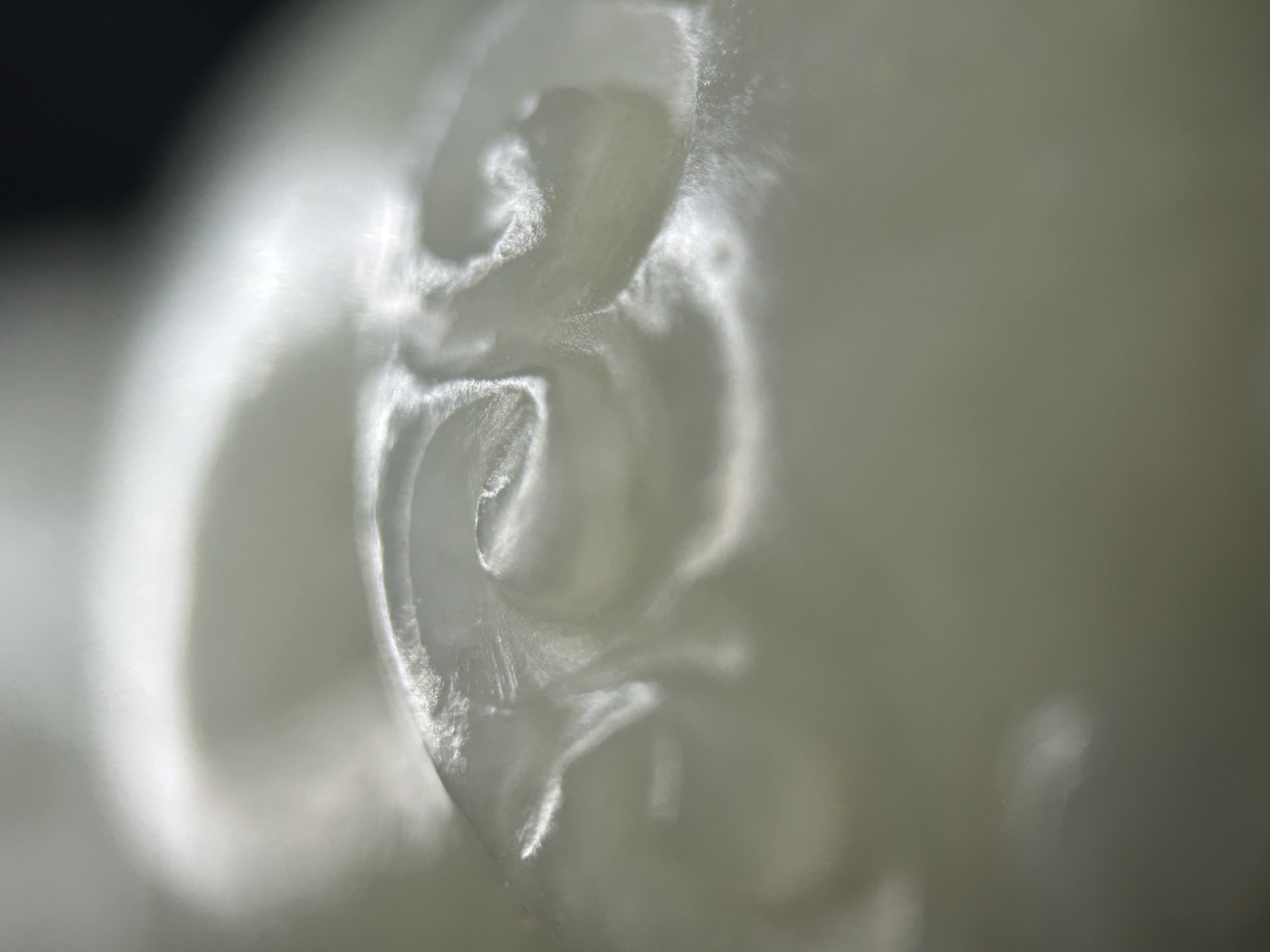 1、鼻烟壶题材不会早过清代,从掏膛、表面砣痕看,应是老工; 2、皮色稍显不自然,有可能是因为拍照的光线条件问题,但怀疑有二次上色的可能,需看实物才能确认。 3、实际上,由于光线问题,整体也很难对玉料的颜色进行判断,实物可能更偏灰青一些。建议下次在白天自然光下拍照(避免夕阳、日出这种偏光环境),这也会极大影响价值判断。 4、“雪花玉”的审美非常见仁见智,不喜者认为是玉料致密度的瑕疵,喜欢者觉得稀世难得,这会对评估造成比较大的困难和波动,比较挑买家。 5、图片没有展示帽和铲,所以不能算作“整器”,对价值评估也会产生负面影响。