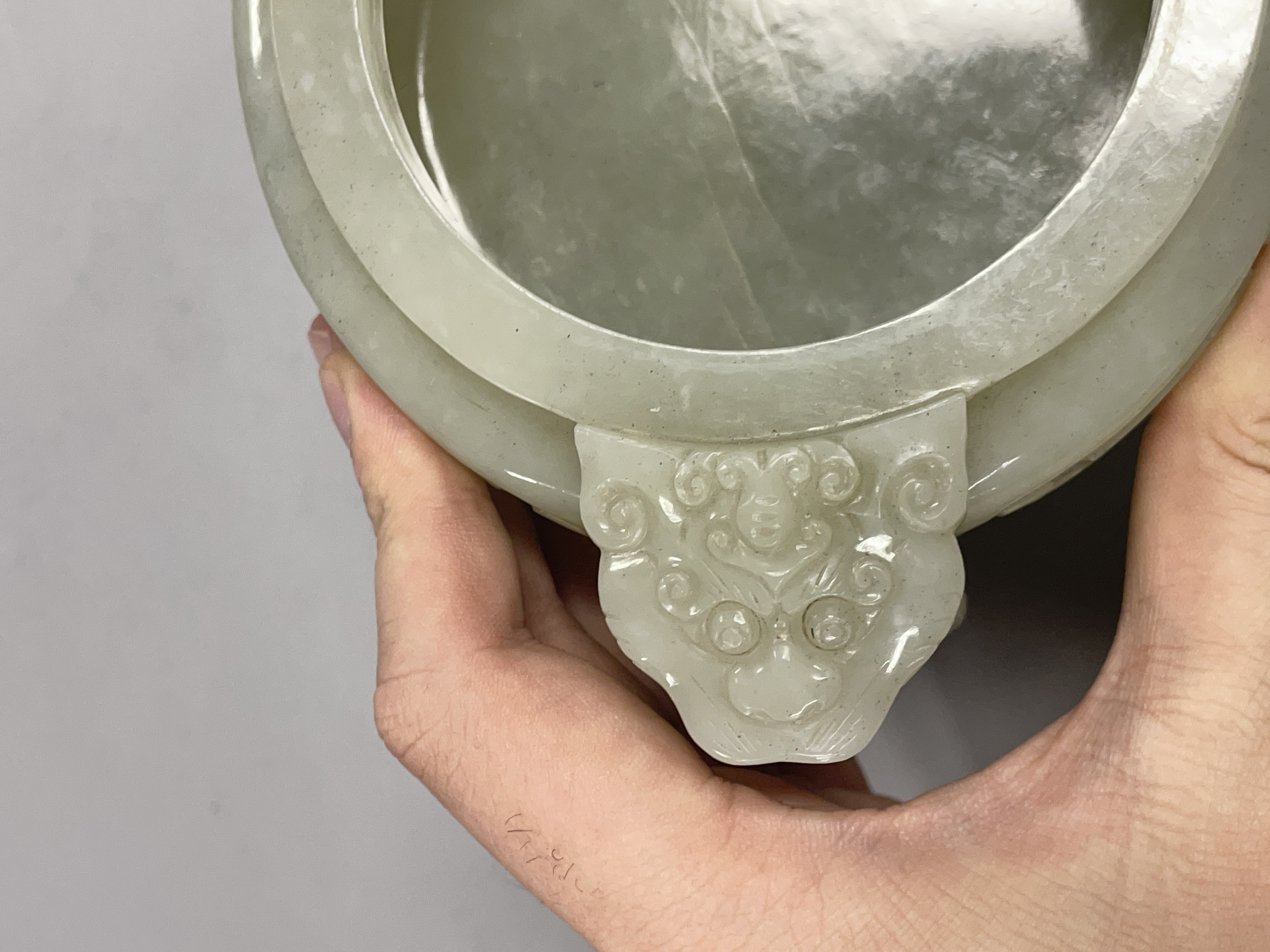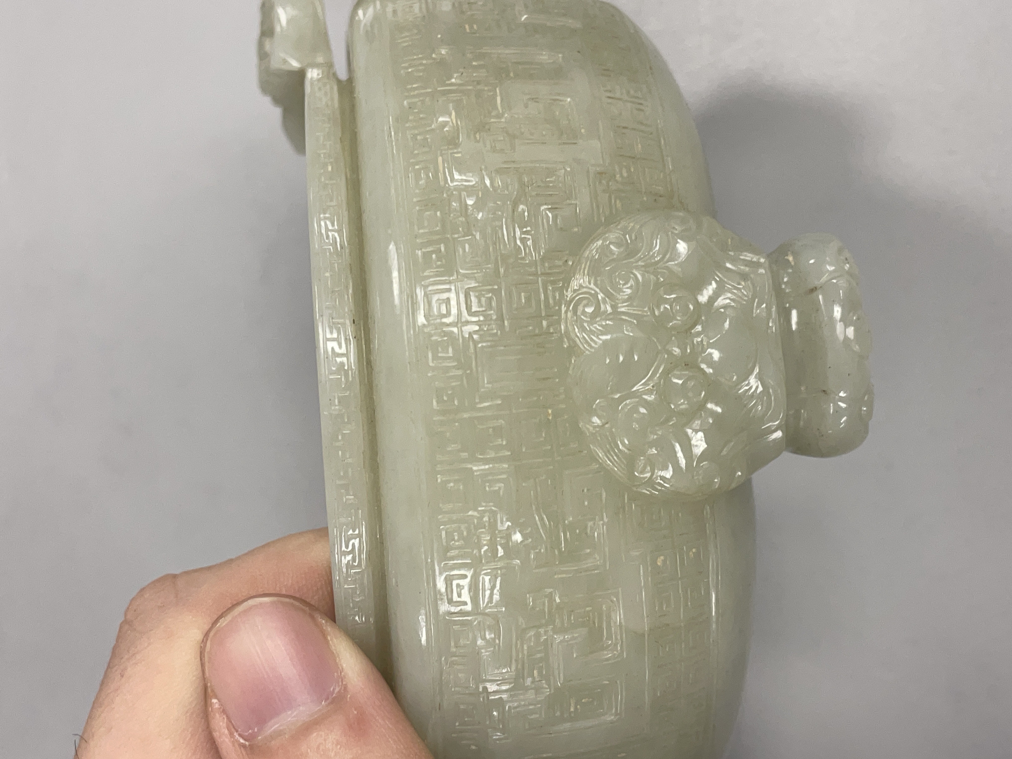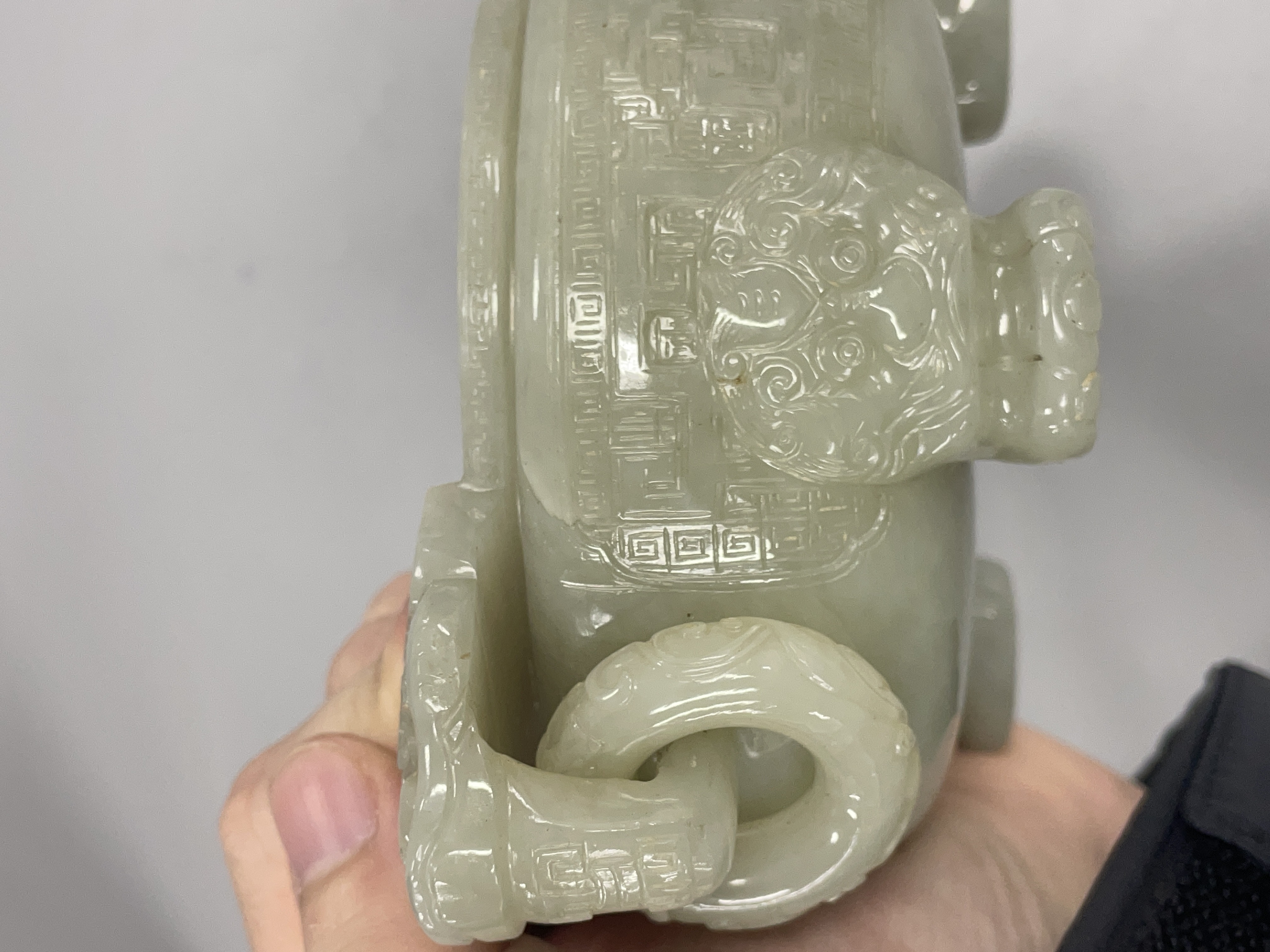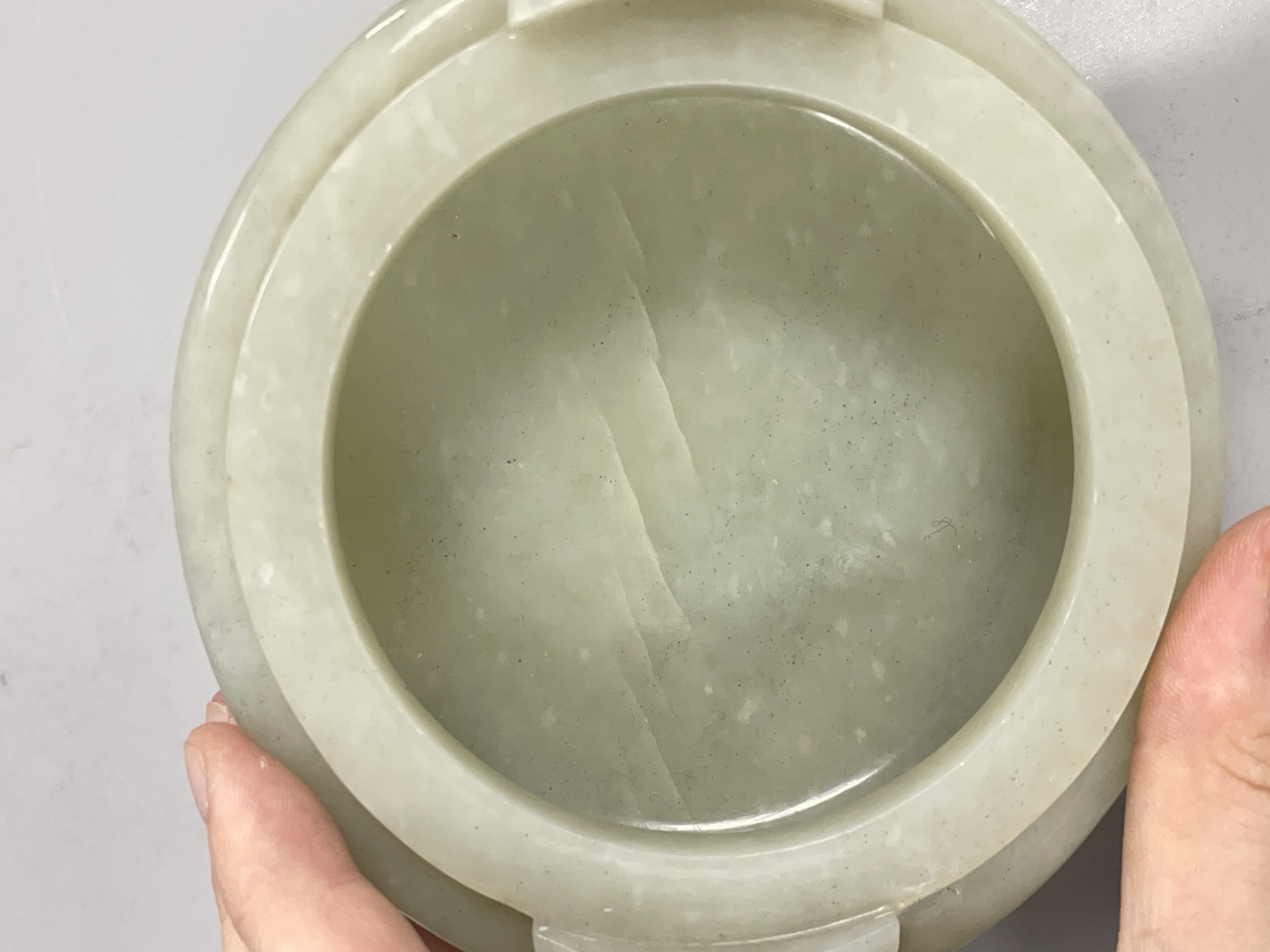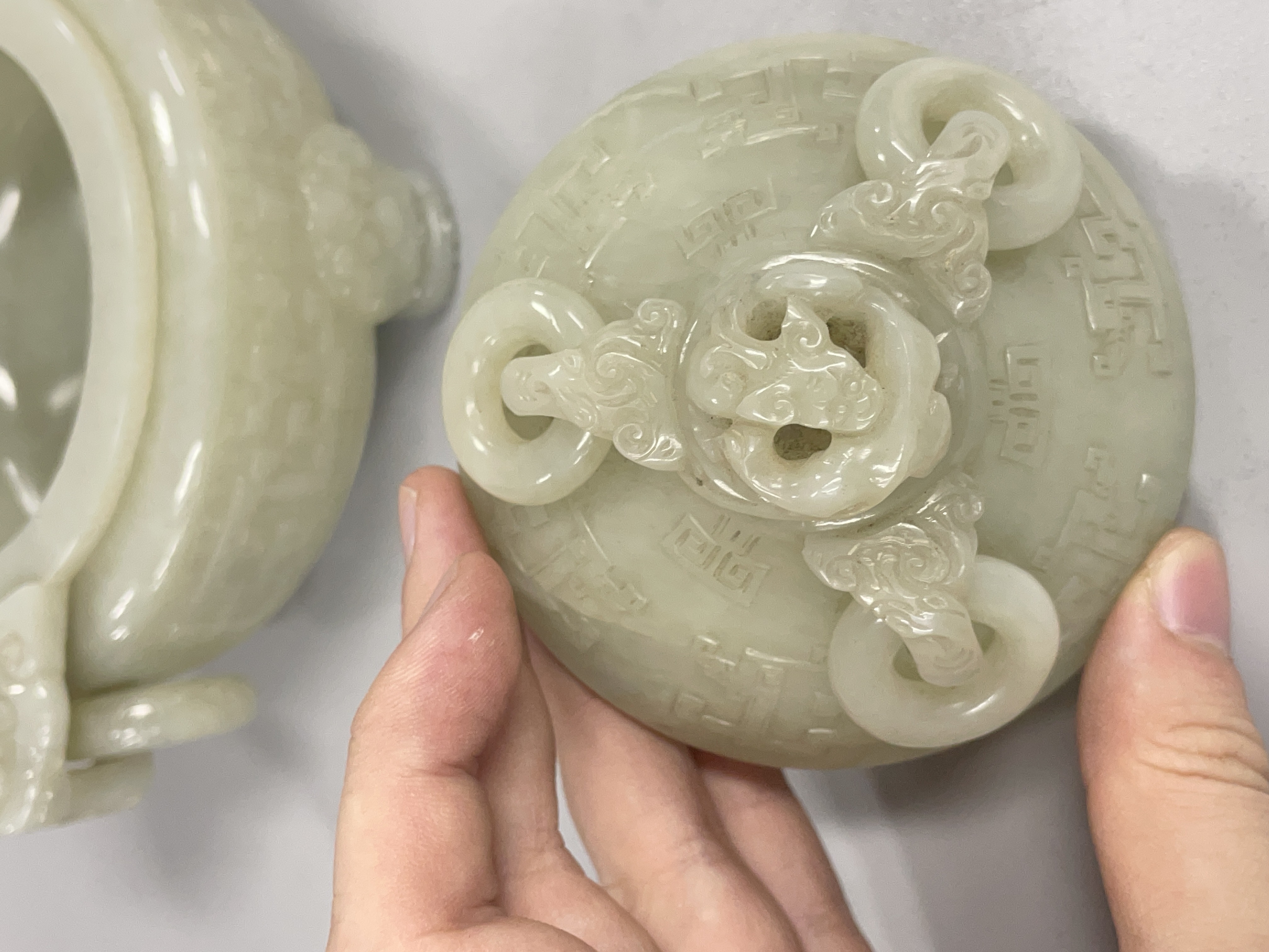 就图看,材质和田料子,色青白,有棉带墨点,开门老带工玉香炉造型:龙纹活环钮盖;双龙耳活环;饕餮纹;三兽足,形制符合时代特征,刀工有力,线条流畅,包浆自然,有绺,老东西:创汇期,可藏。