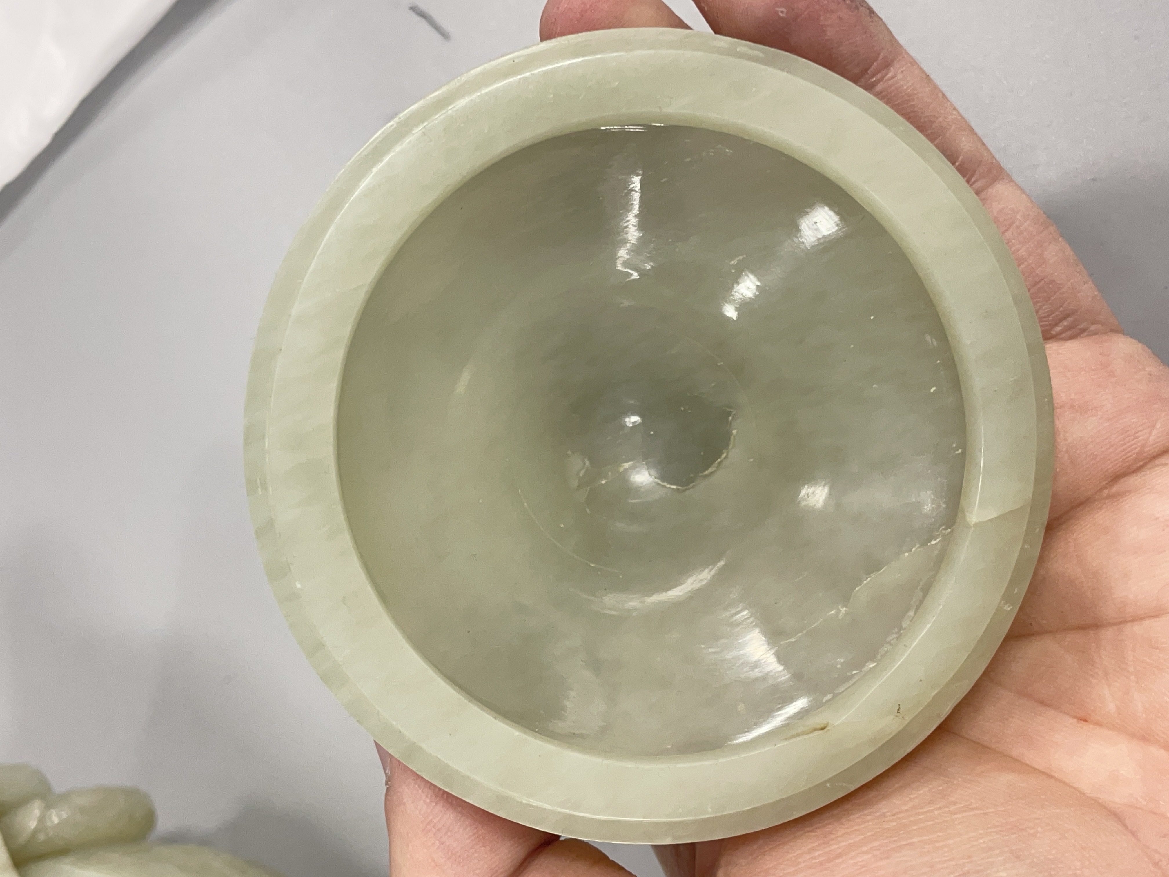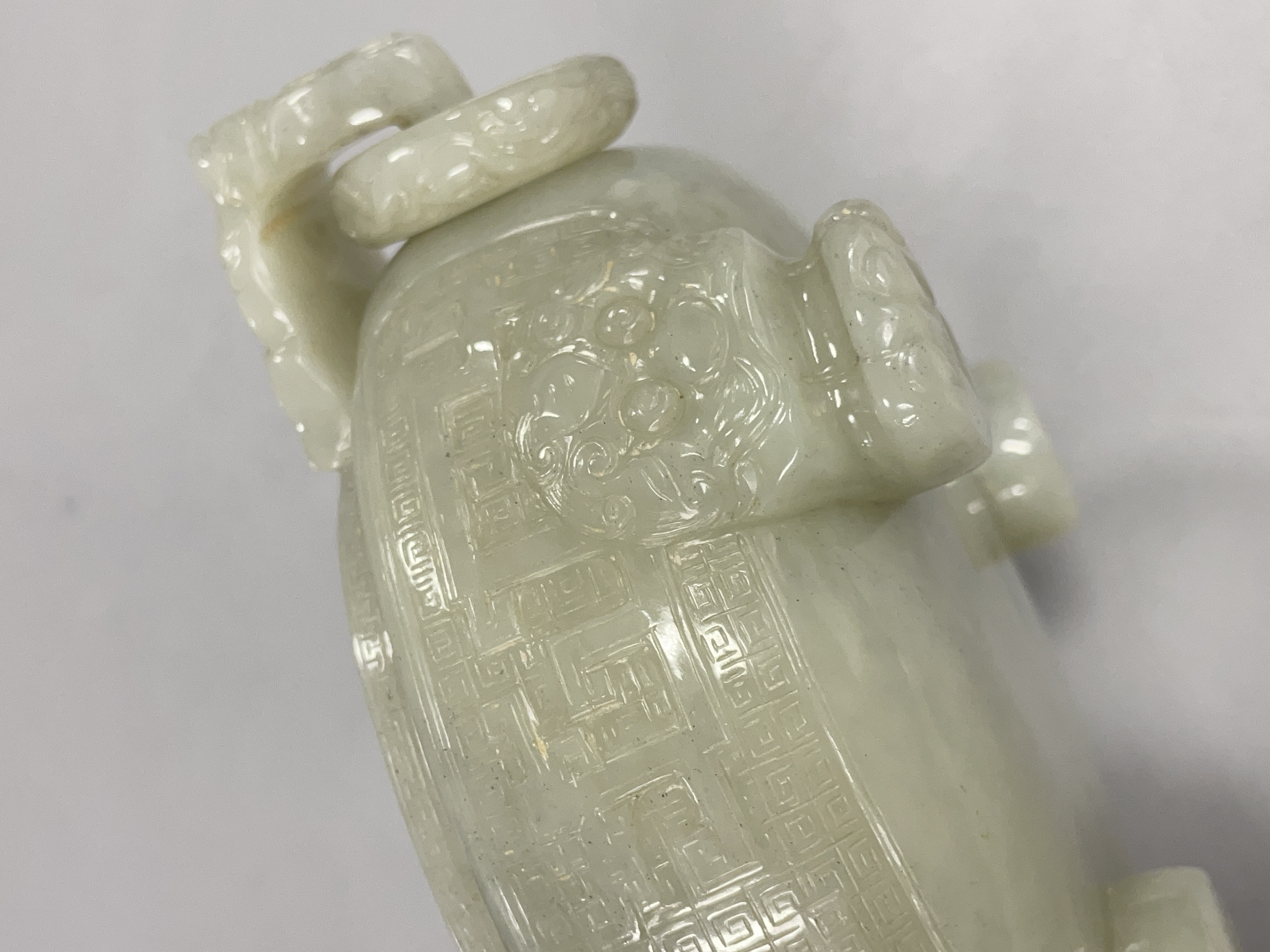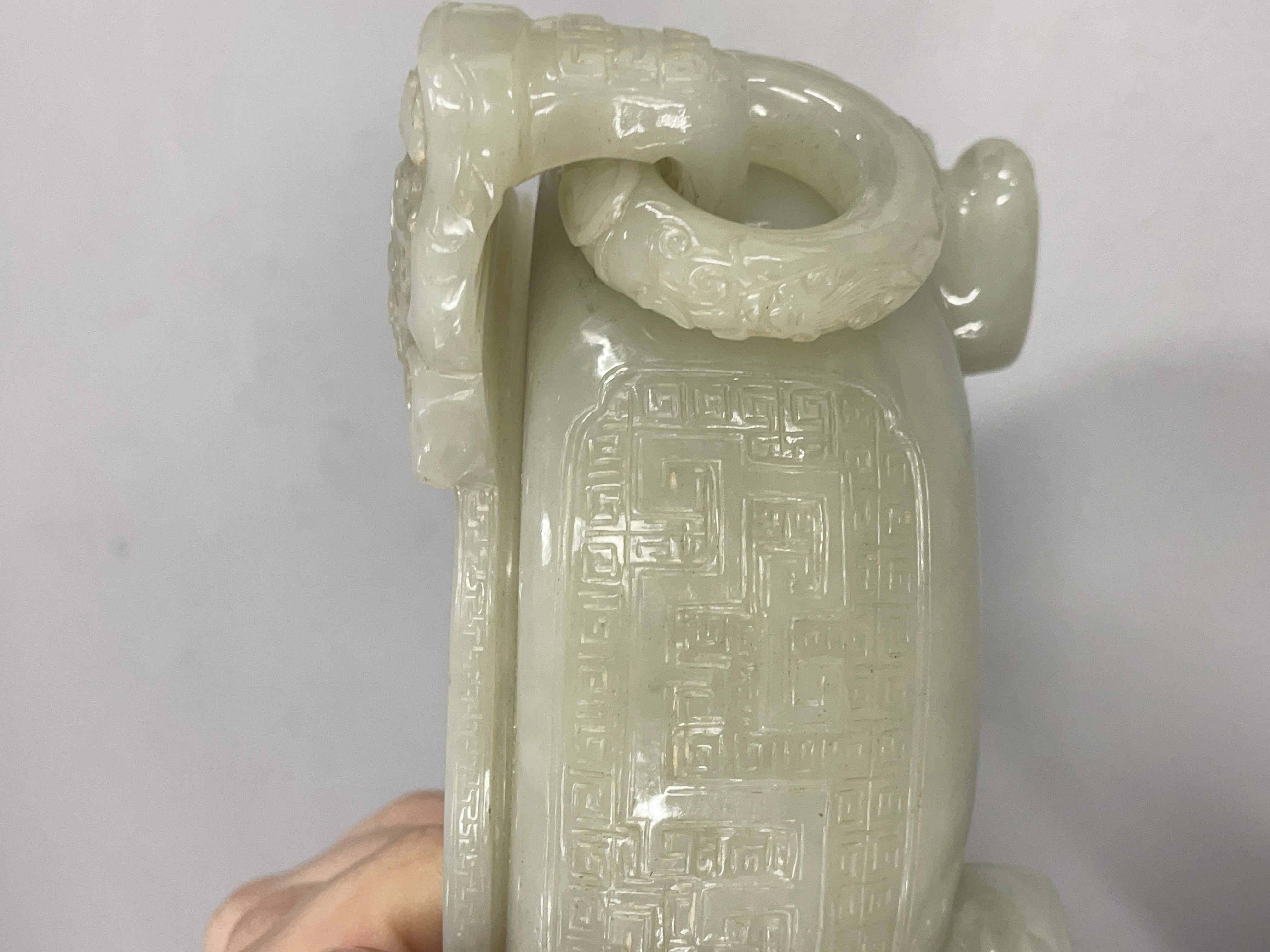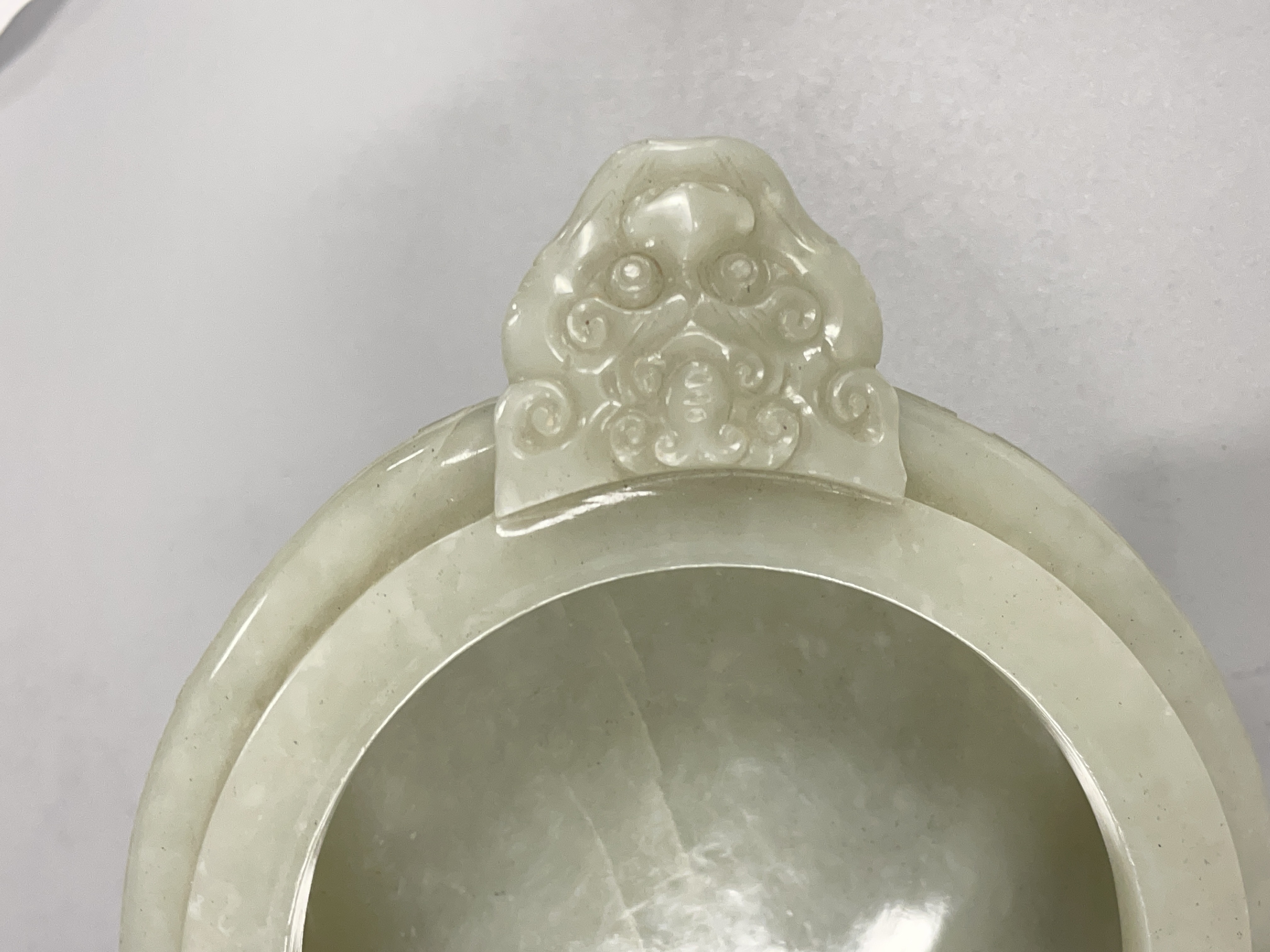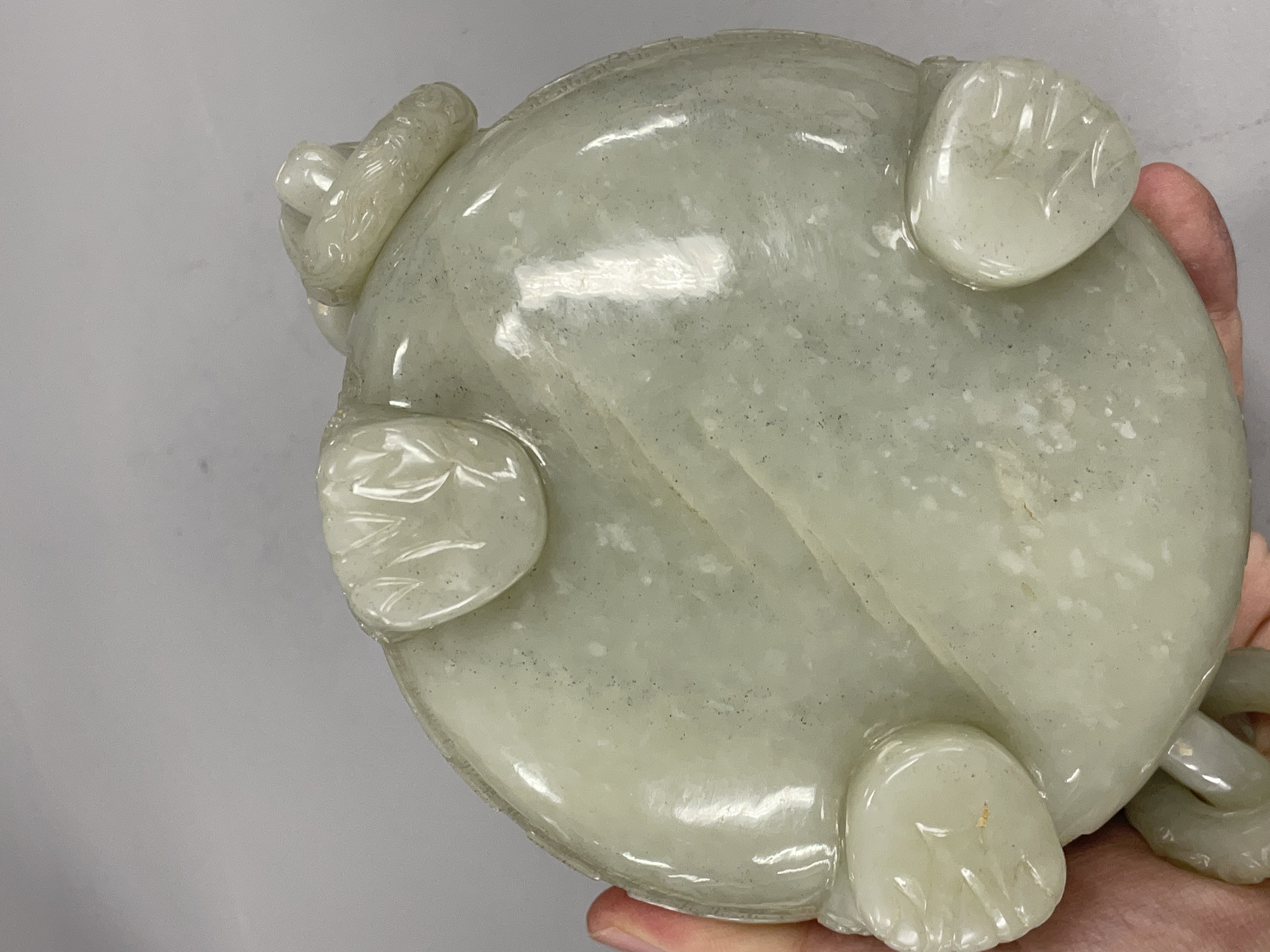 就图看,材质和田料子,色青白,有棉带墨点,开门老带工玉香炉造型:龙纹活环钮盖;双龙耳活环;饕餮纹;三兽足,形制符合时代特征,刀工有力,线条流畅,包浆自然,有绺,老东西:创汇期,可藏。
