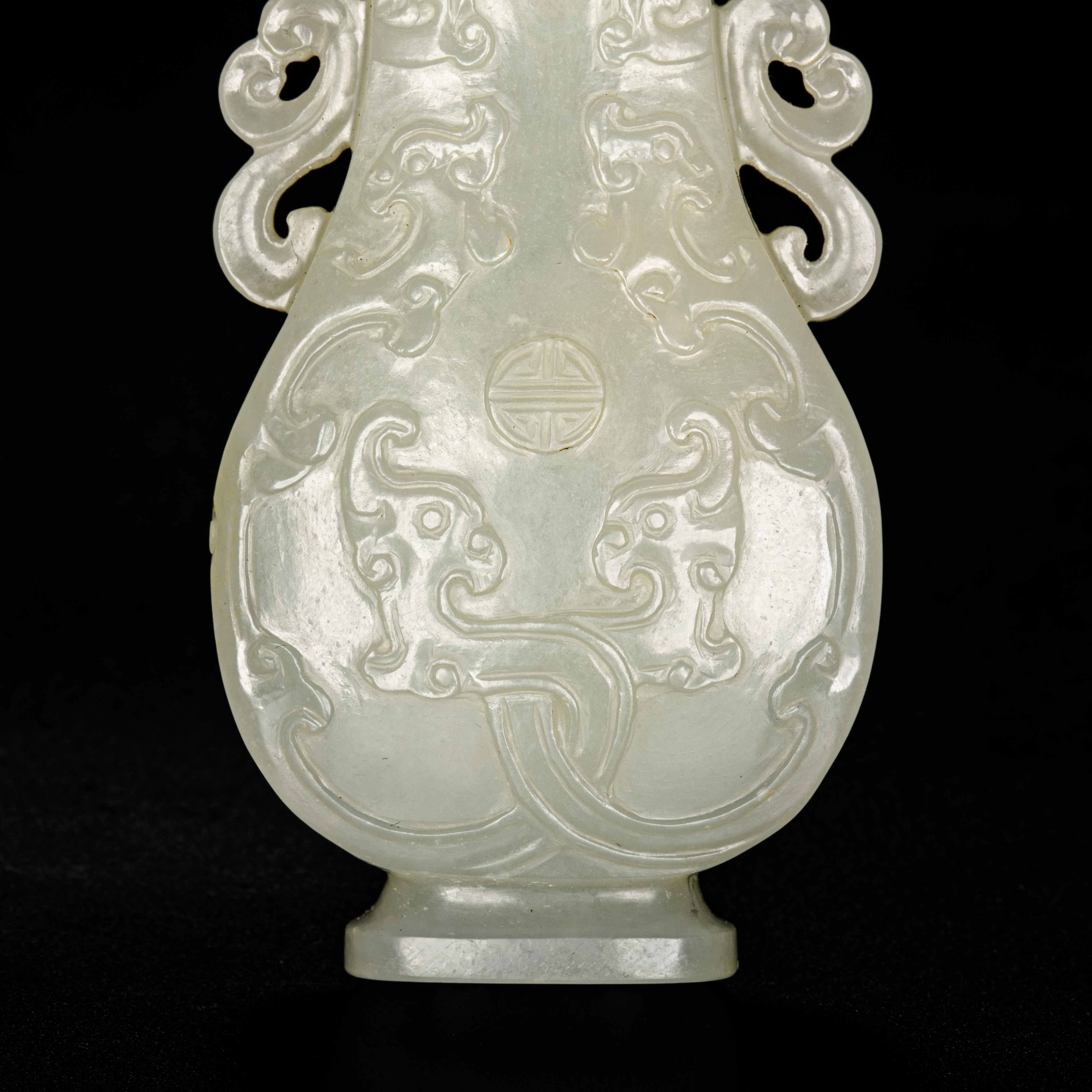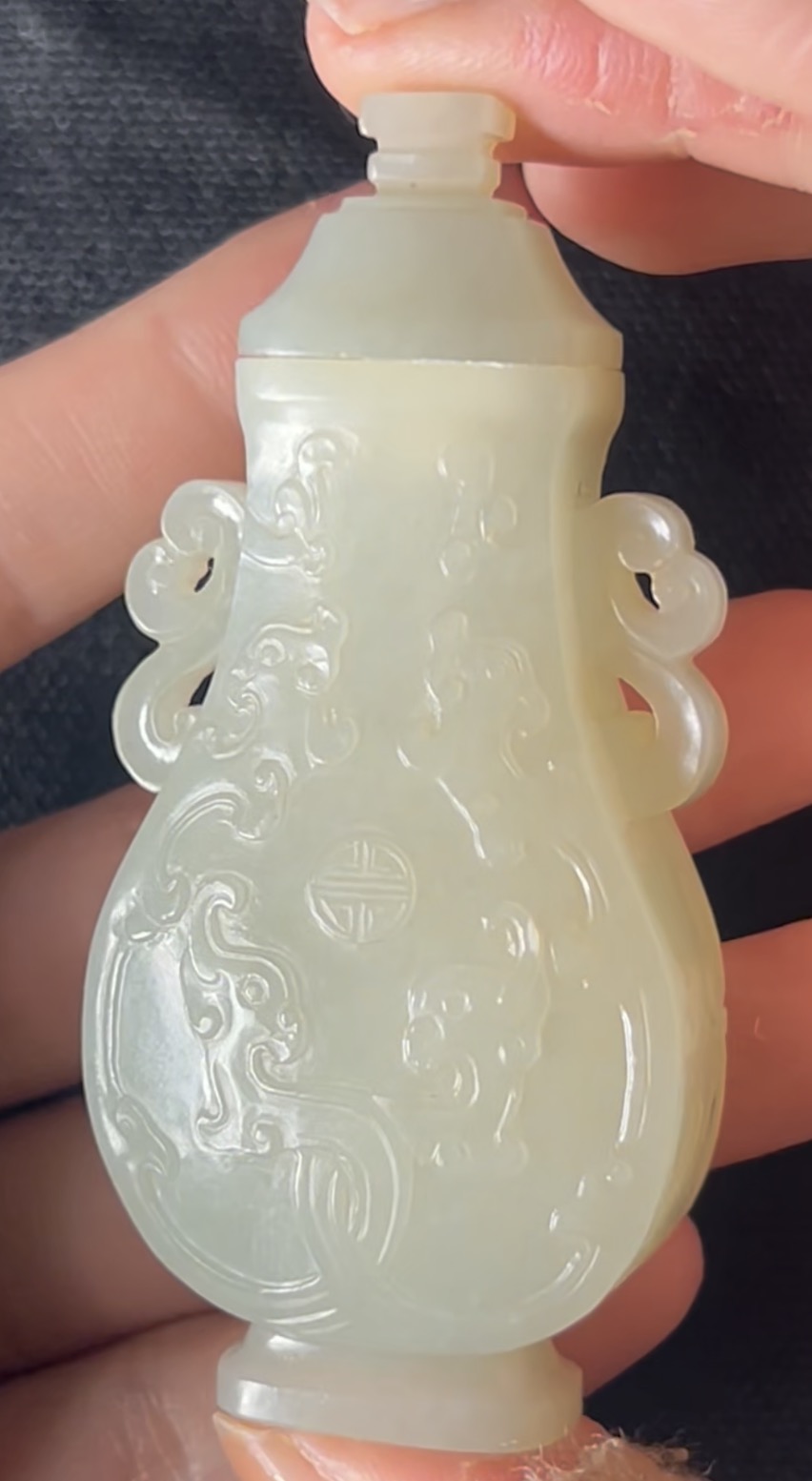就图看,材质和田料子,质地细腻,开门老满工玉赏瓶造型:双龙纹;双耳;团寿纹;形制符合时代特征,工艺精细,刀工有力,线条流畅,包浆自然,老东西:清中晚期,可藏。估价:4万元左右