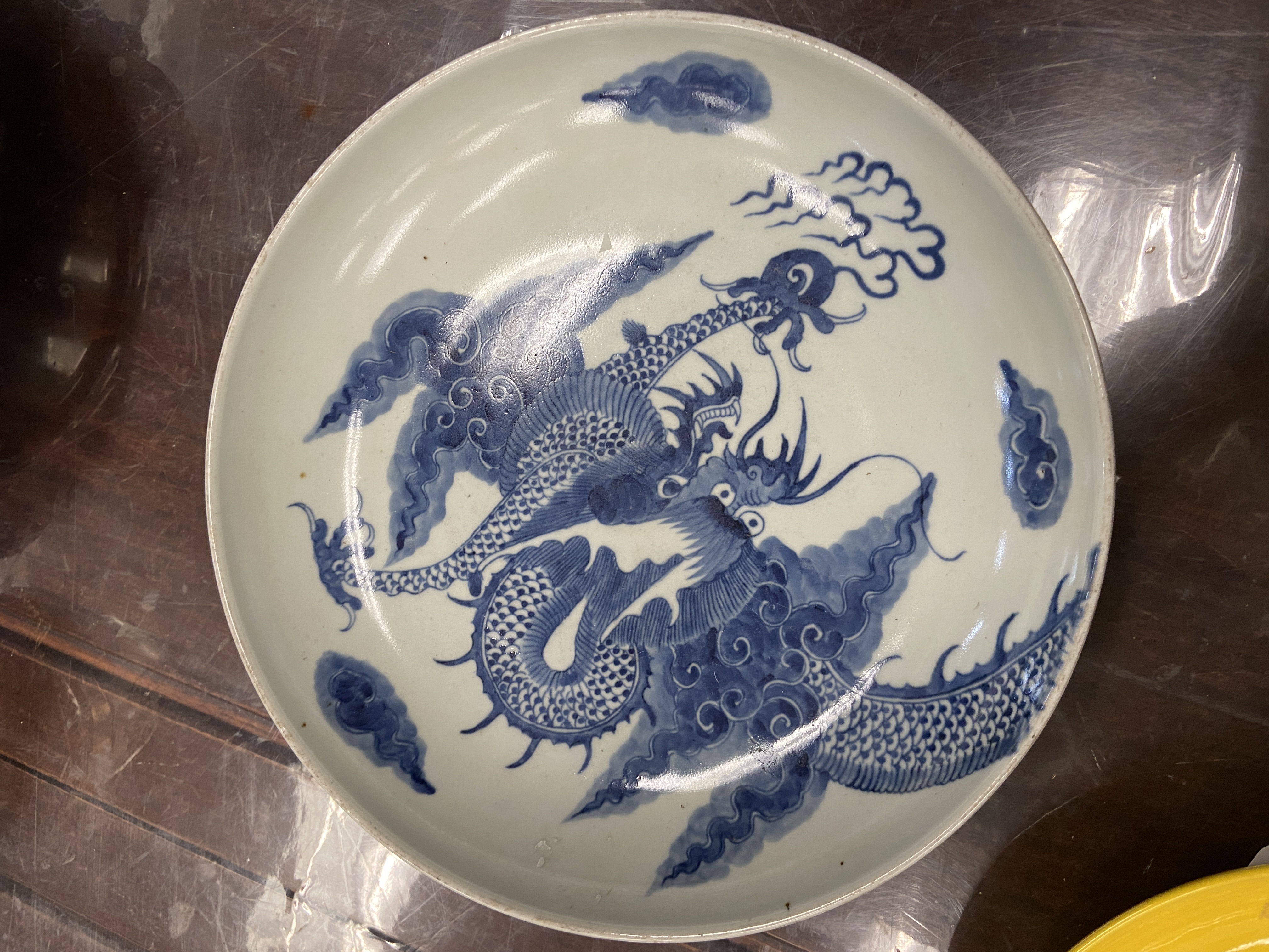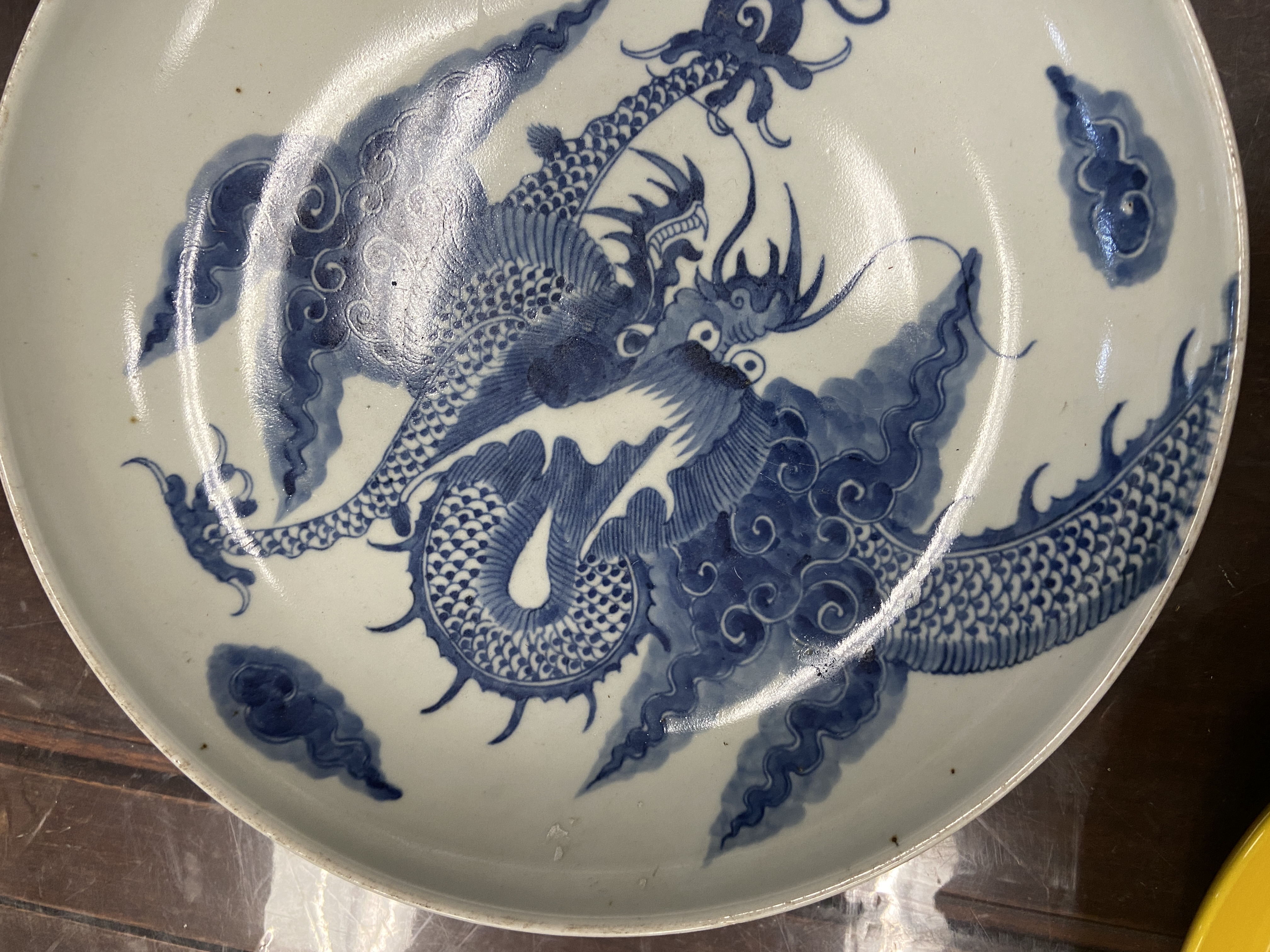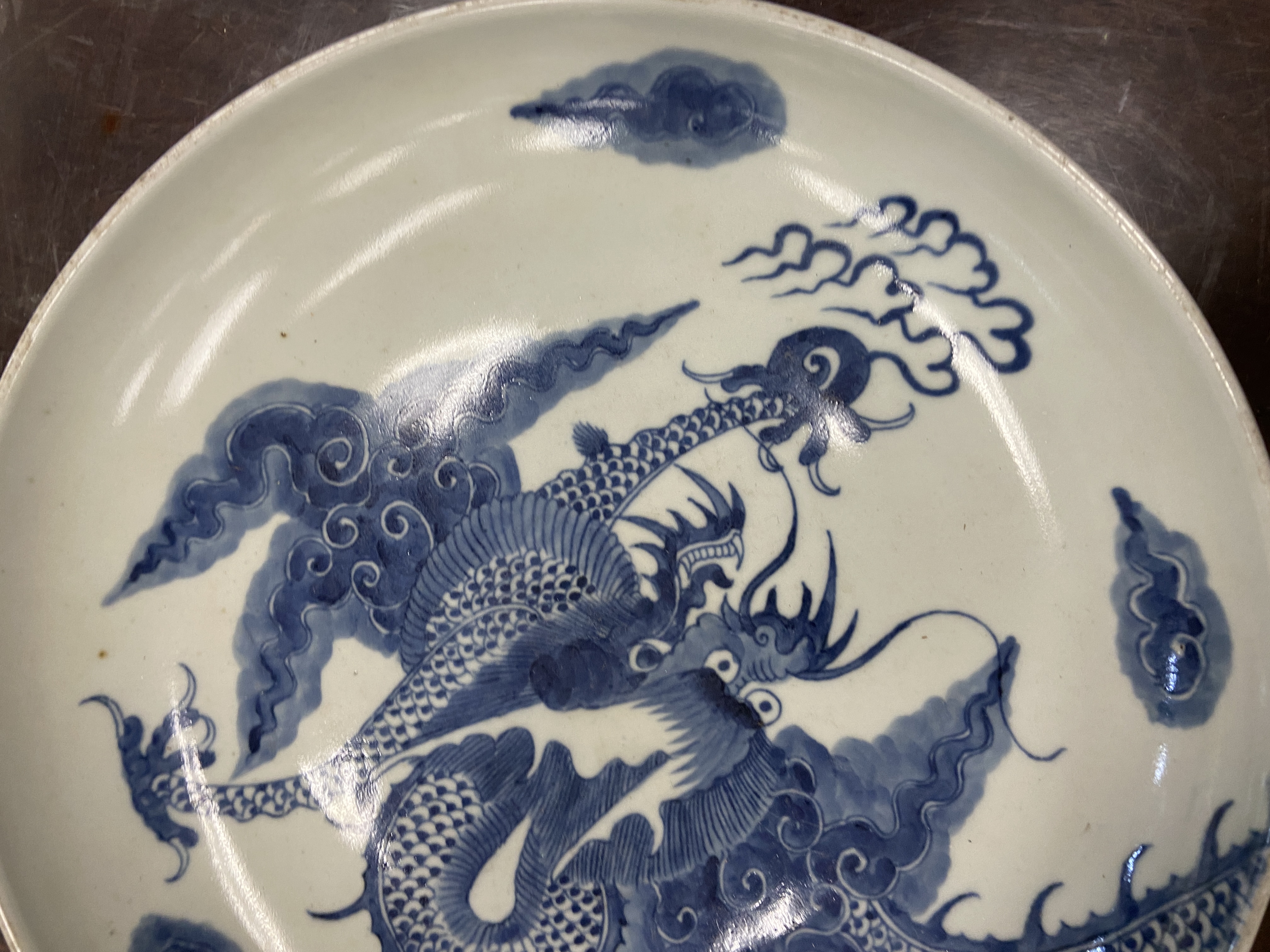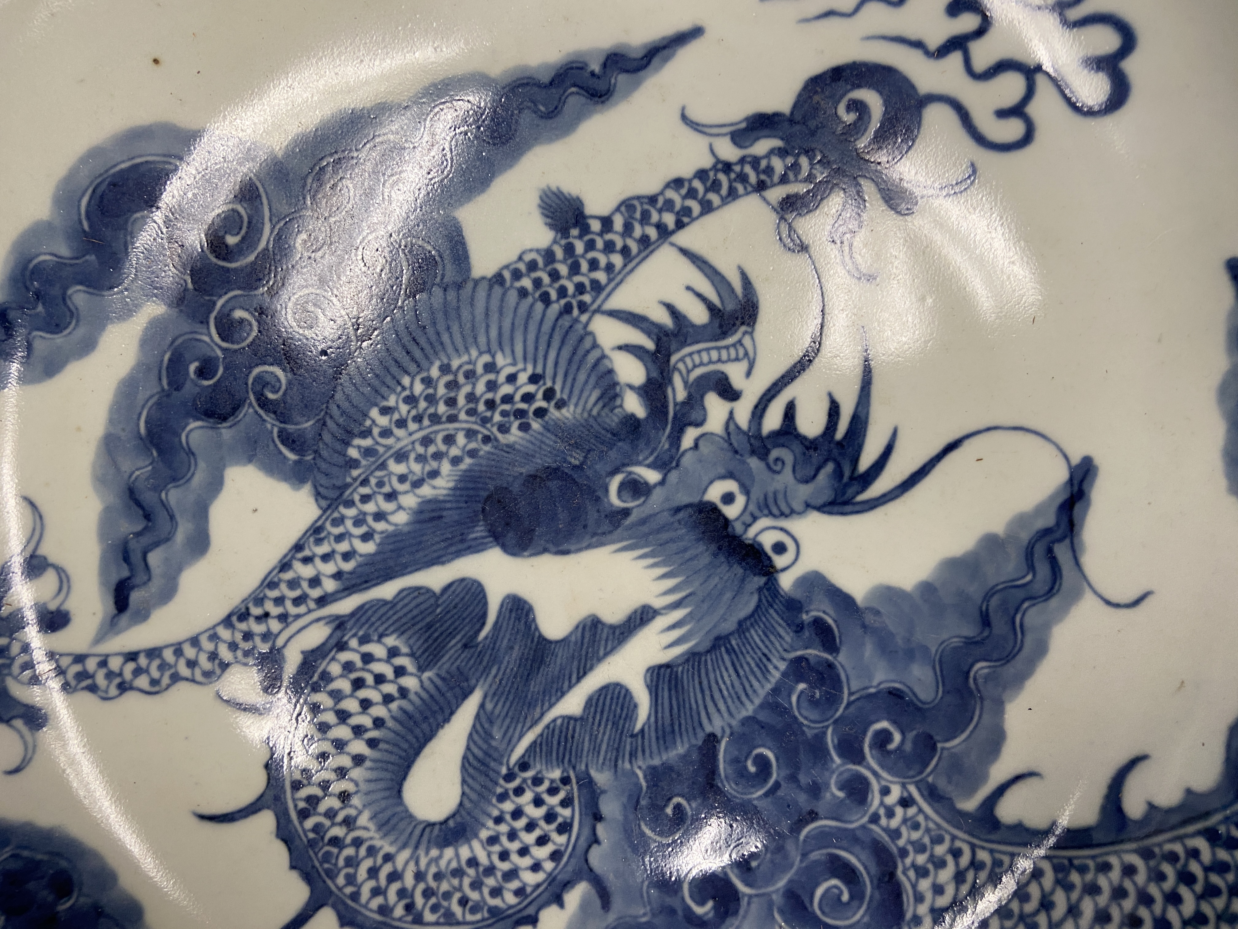 由所提供的图片来看,此过墙龙纹青花盘纹饰的题材吉祥而且传统,为清代雍乾时期景德镇窑口风格,如果到代且品相完好,则有较高的收藏价值,小万元。但是其青花的发色漂浮,纹饰的线条凌乱粗糙,胎质显湿欠干爽,沁色肤浅不入胎,综合判断为当代仿古工艺品,可以作为工艺品进行摆賞,请勿作为古玩收藏,以上观点供你参考。
