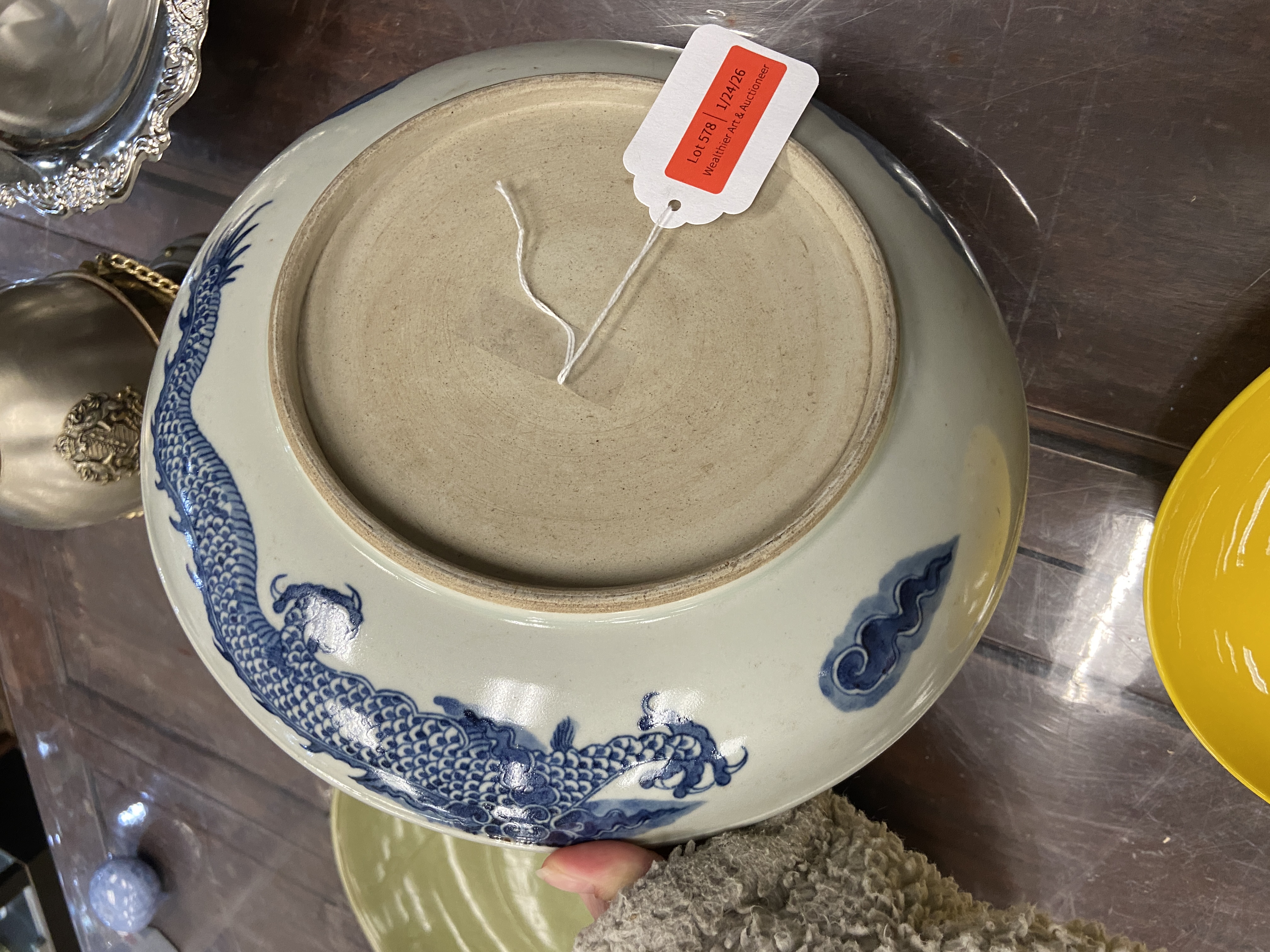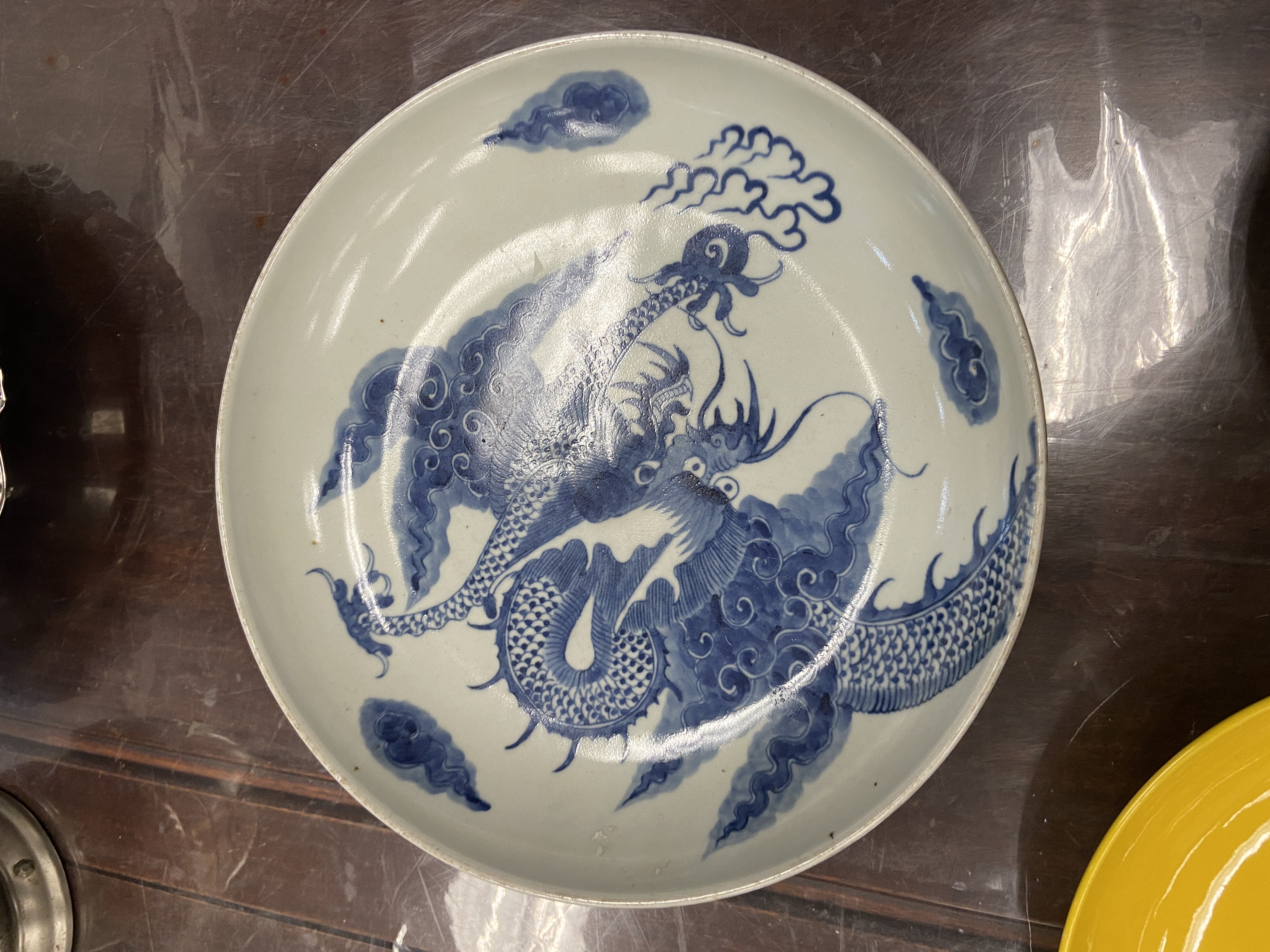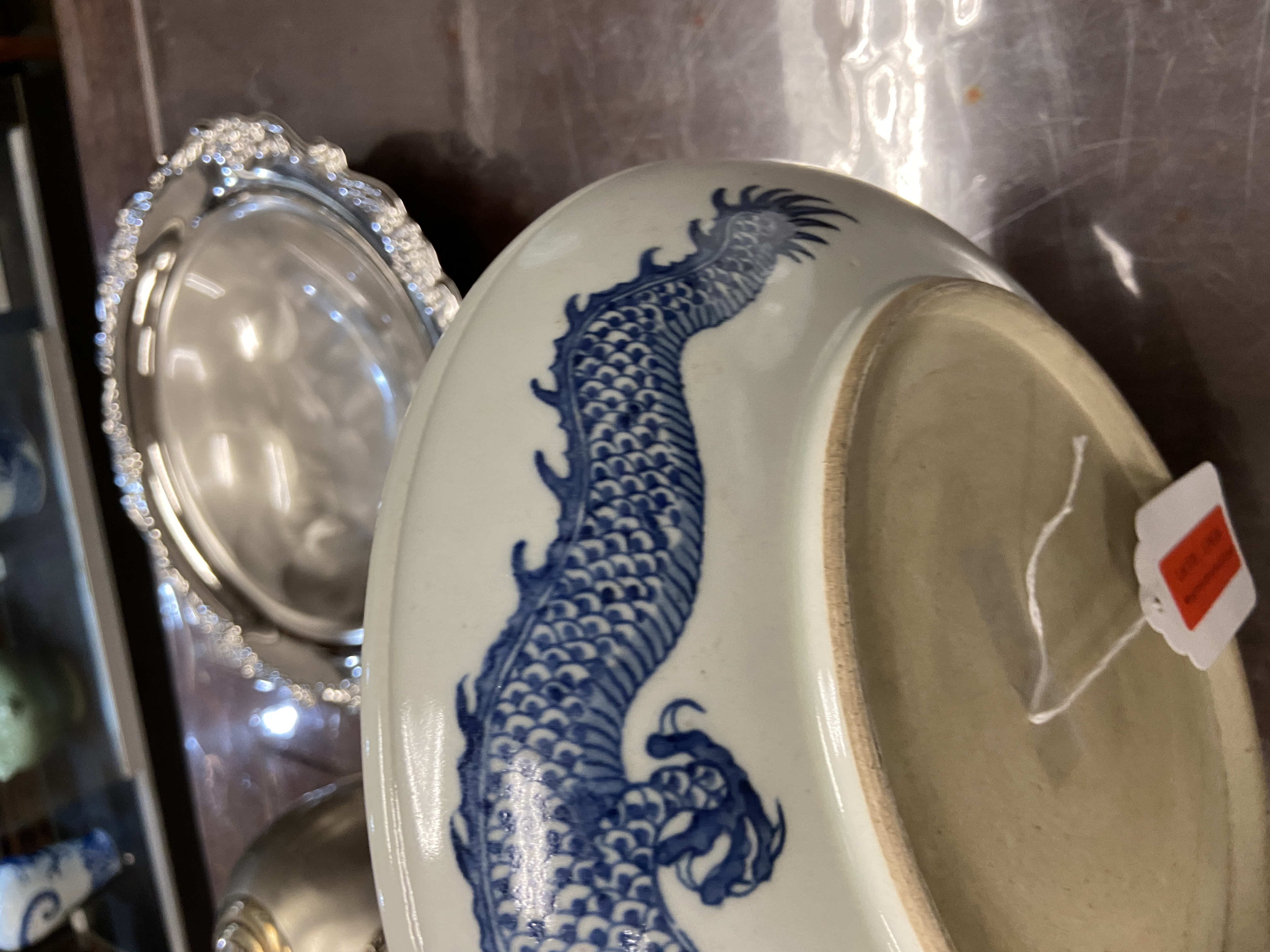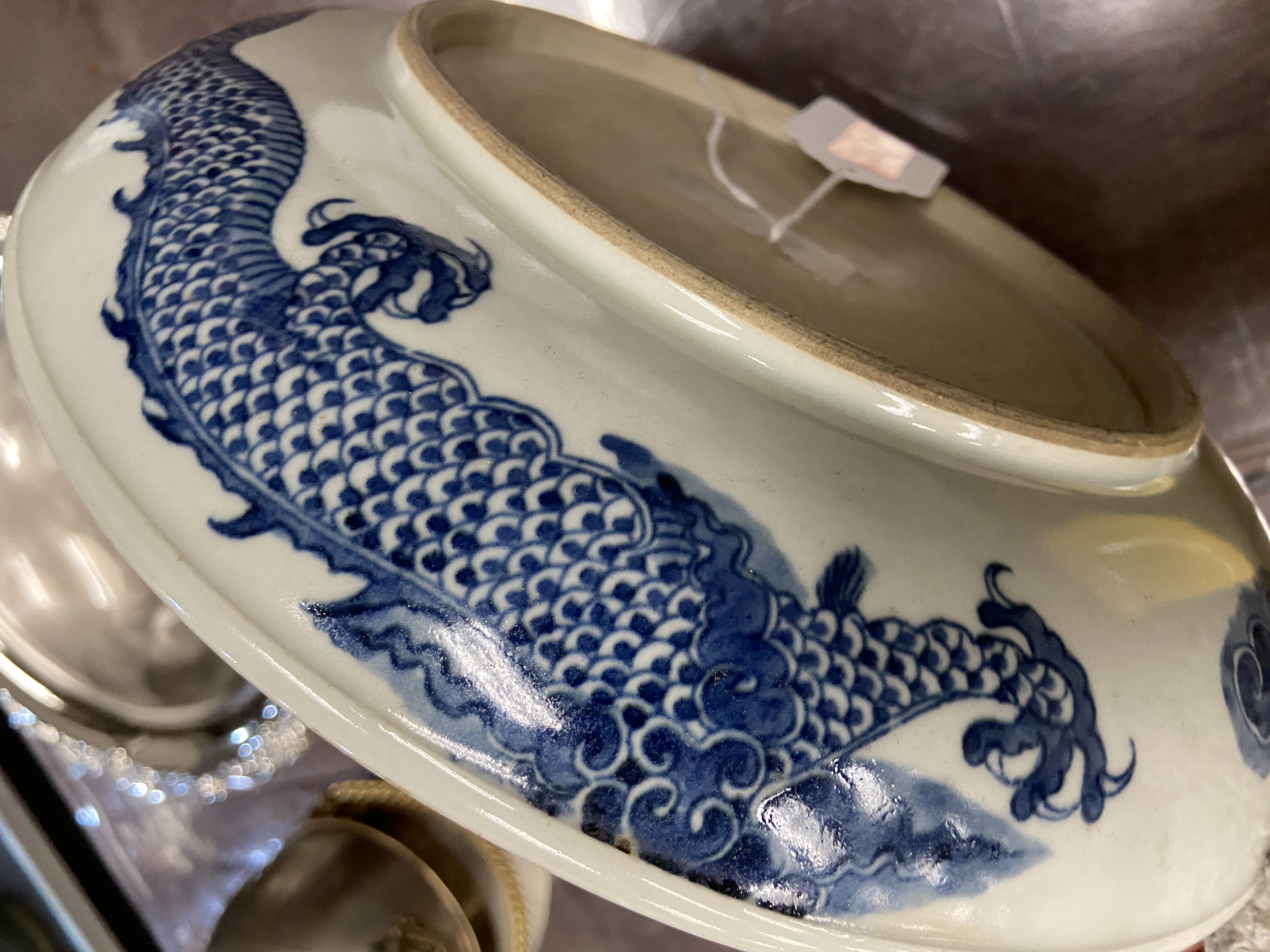 由所提供的图片来看,此过墙龙纹青花盘纹饰的题材吉祥而且传统,为清代雍乾时期景德镇窑口风格,如果到代且品相完好,则有较高的收藏价值,小万元。但是其青花的发色漂浮,纹饰的线条凌乱粗糙,胎质显湿欠干爽,沁色肤浅不入胎,综合判断为当代仿古工艺品,可以作为工艺品进行摆賞,请勿作为古玩收藏,以上观点供你参考。