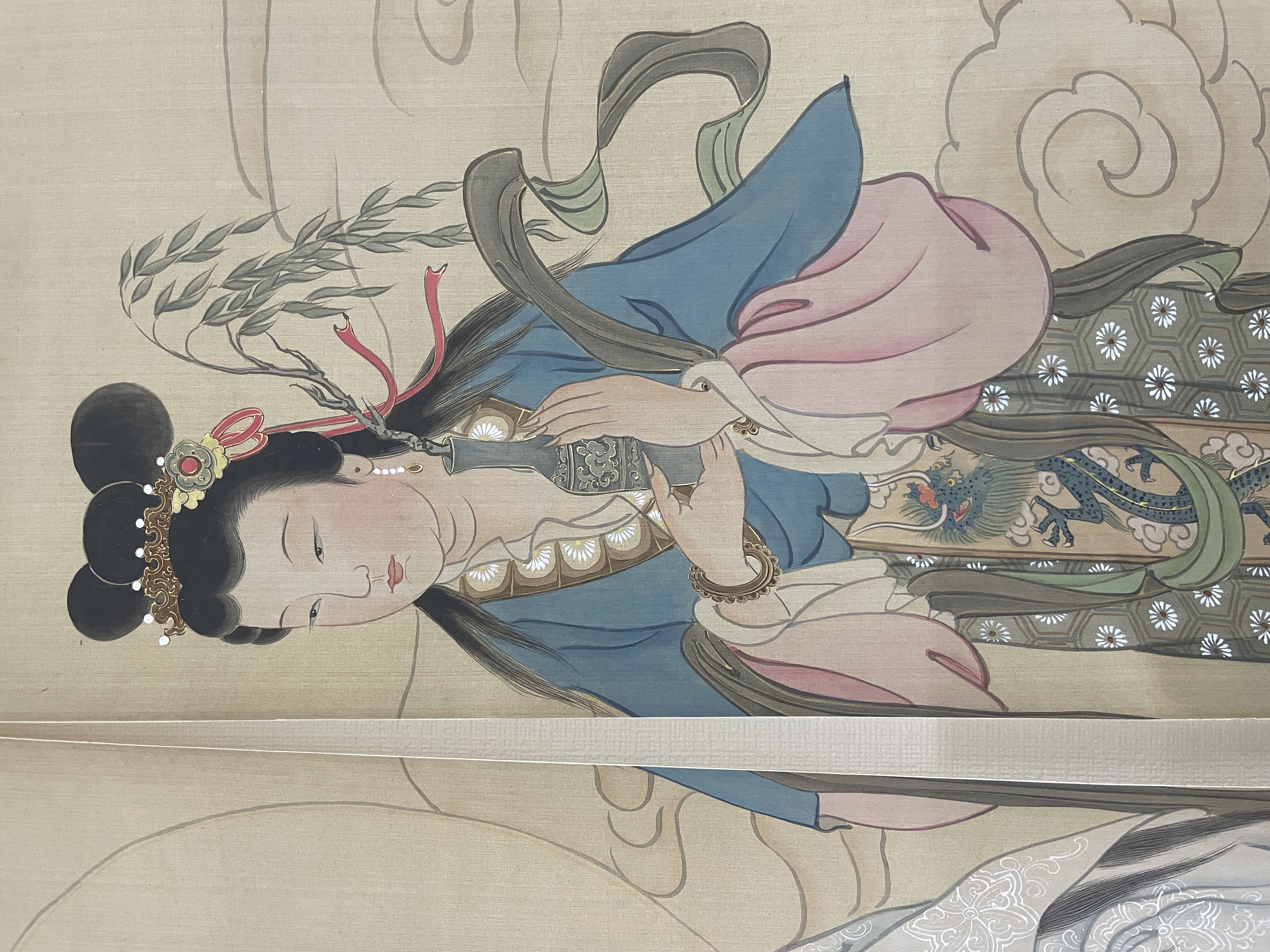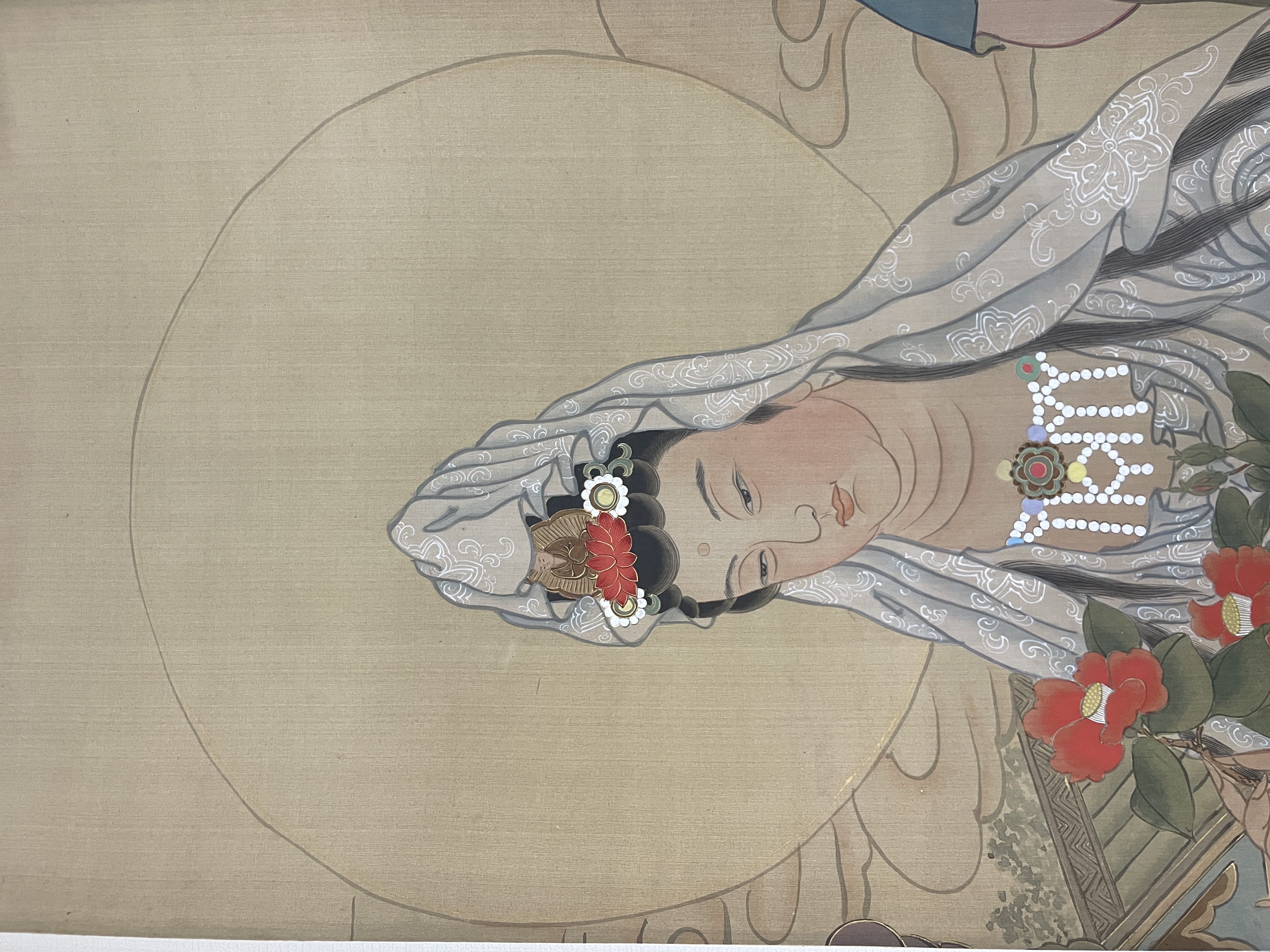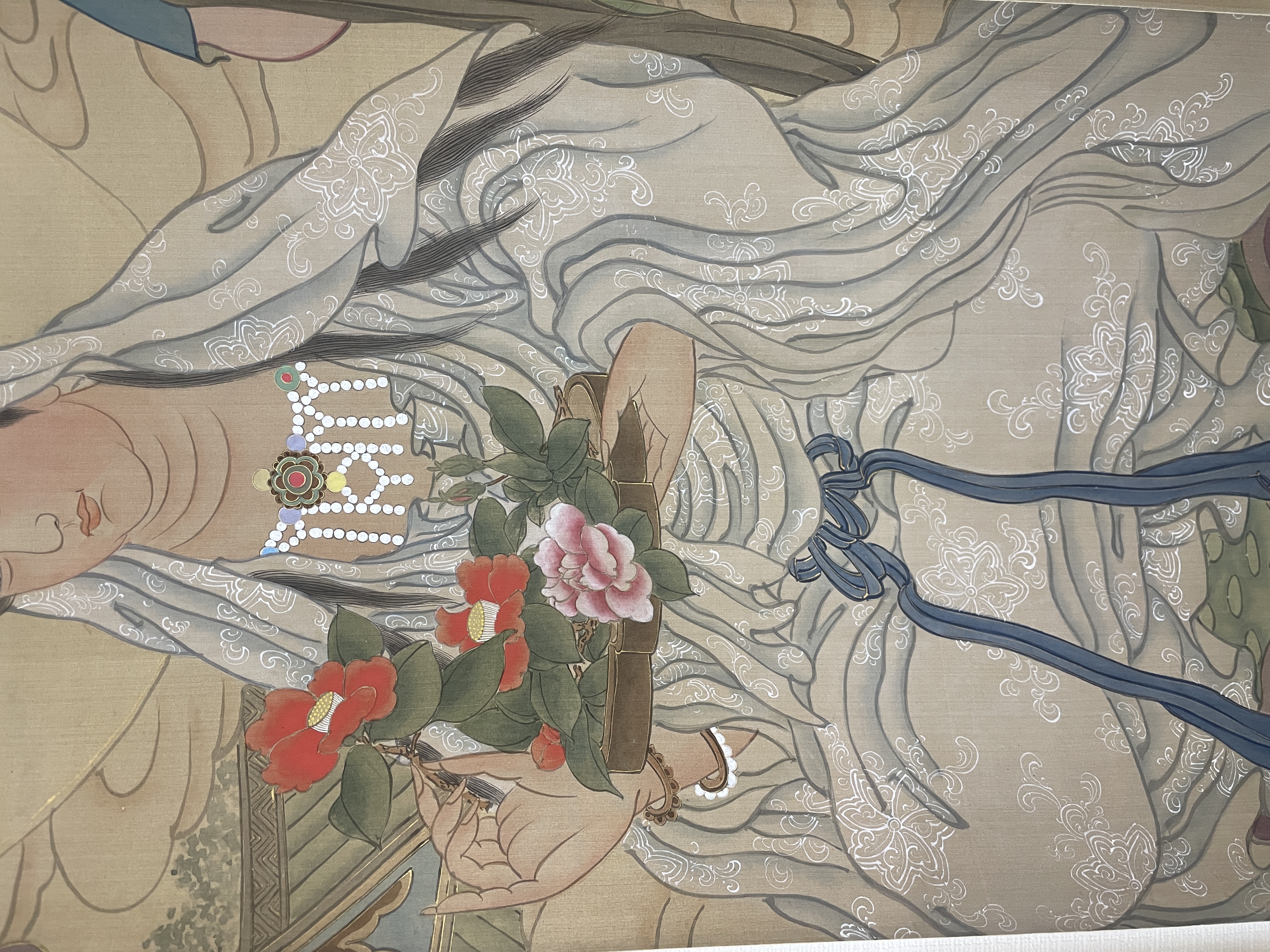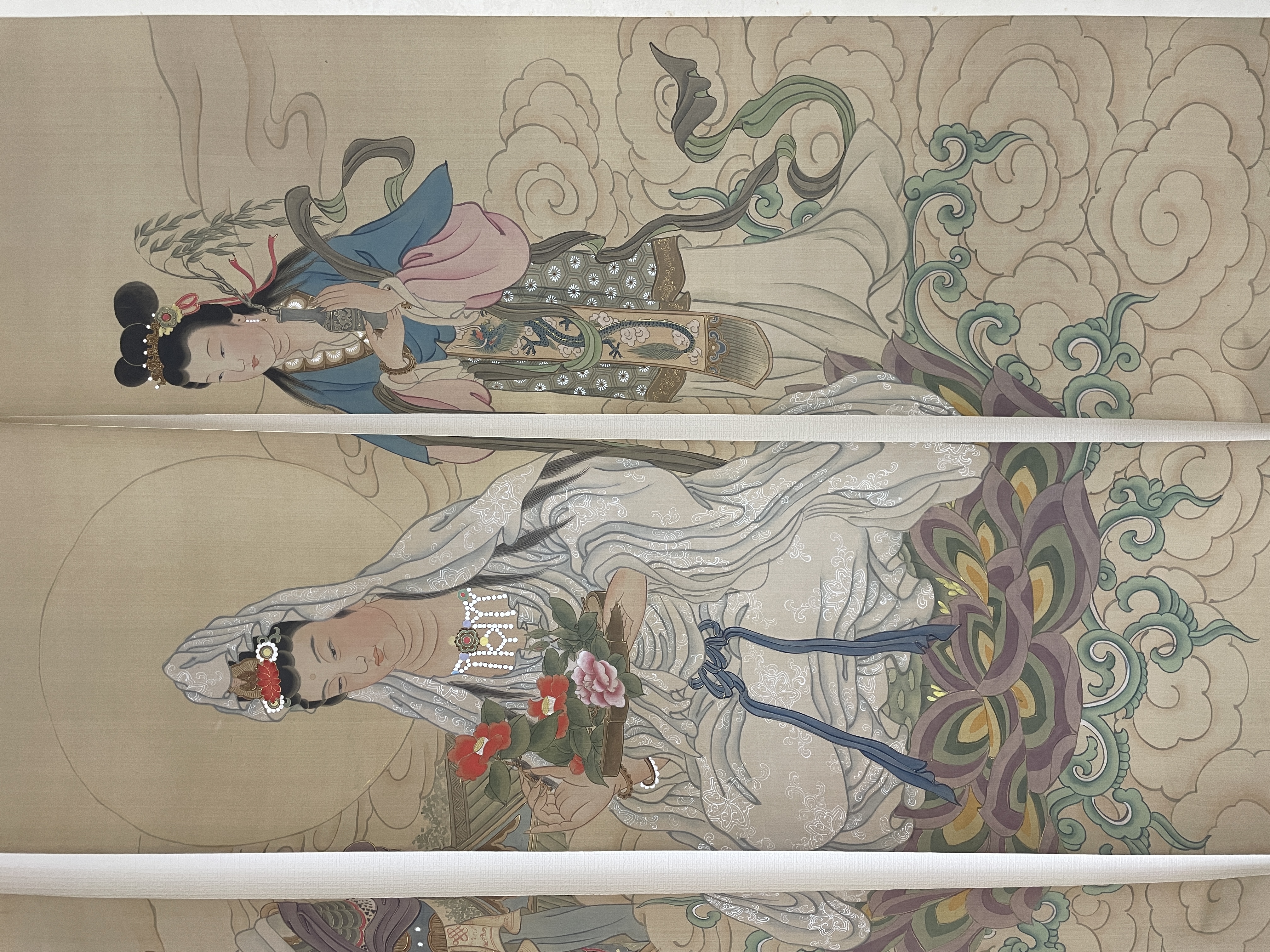 藏友您好!此套《摹敦煌观音大士通景四条屏》,绢本,无款。步月居士题签,印章“老虎”,盒签执石、少石题,印章“安圃”。画工细腻,法相庄严,整体有旧感,初鉴为清末民初佚名画家作品,喜欢可藏。图片鉴定,仅供参考。感谢您的信任与支持!