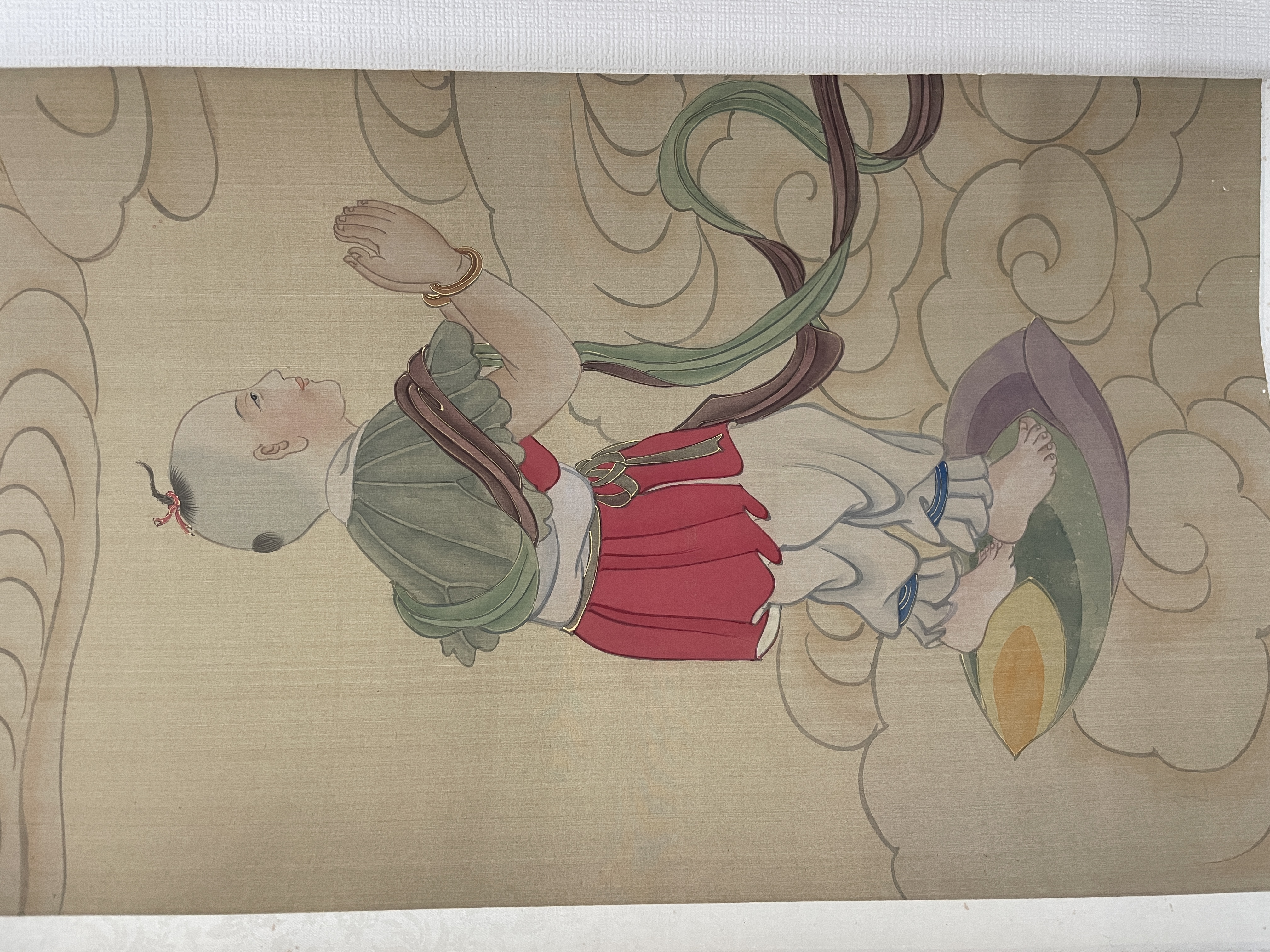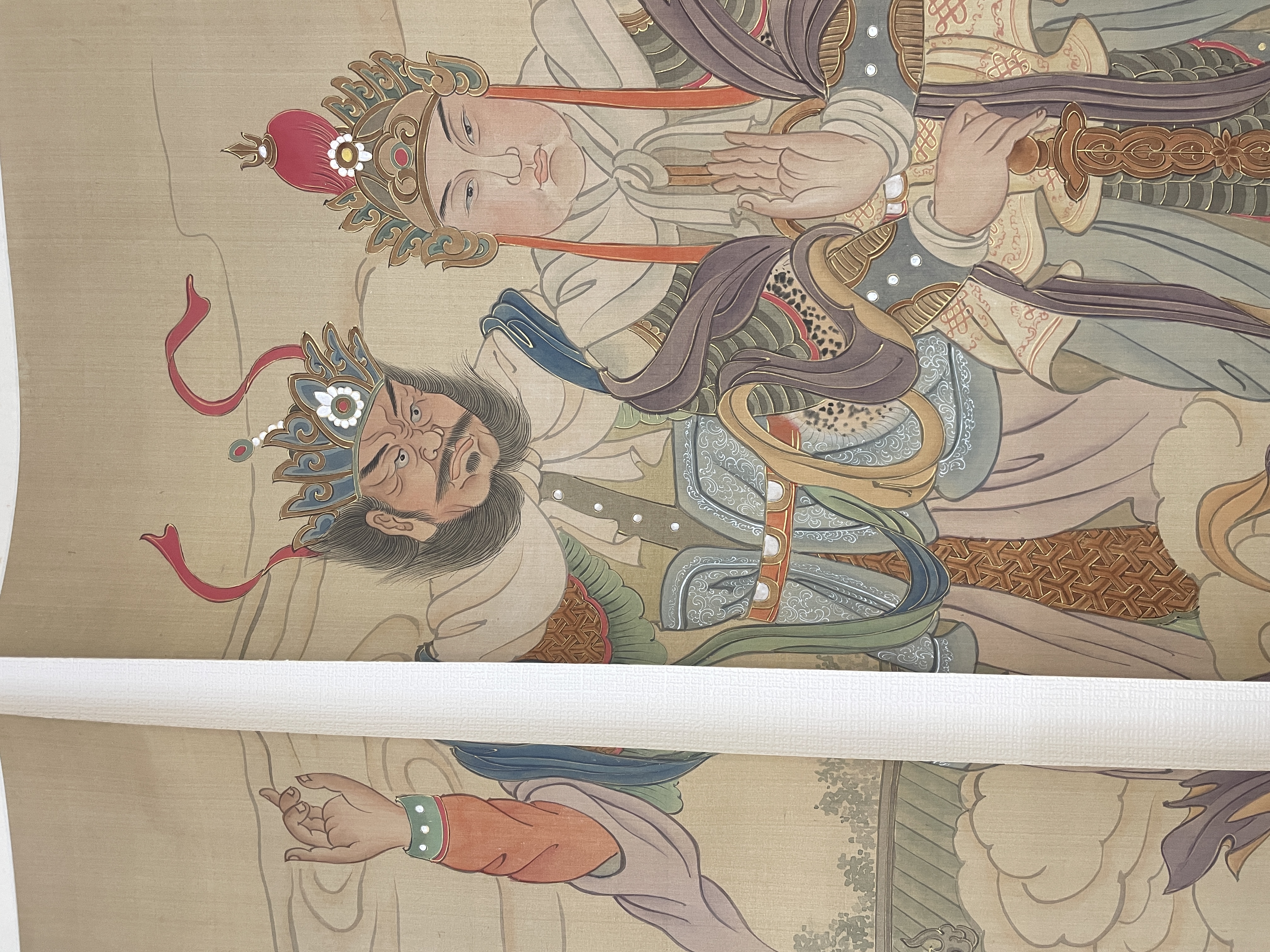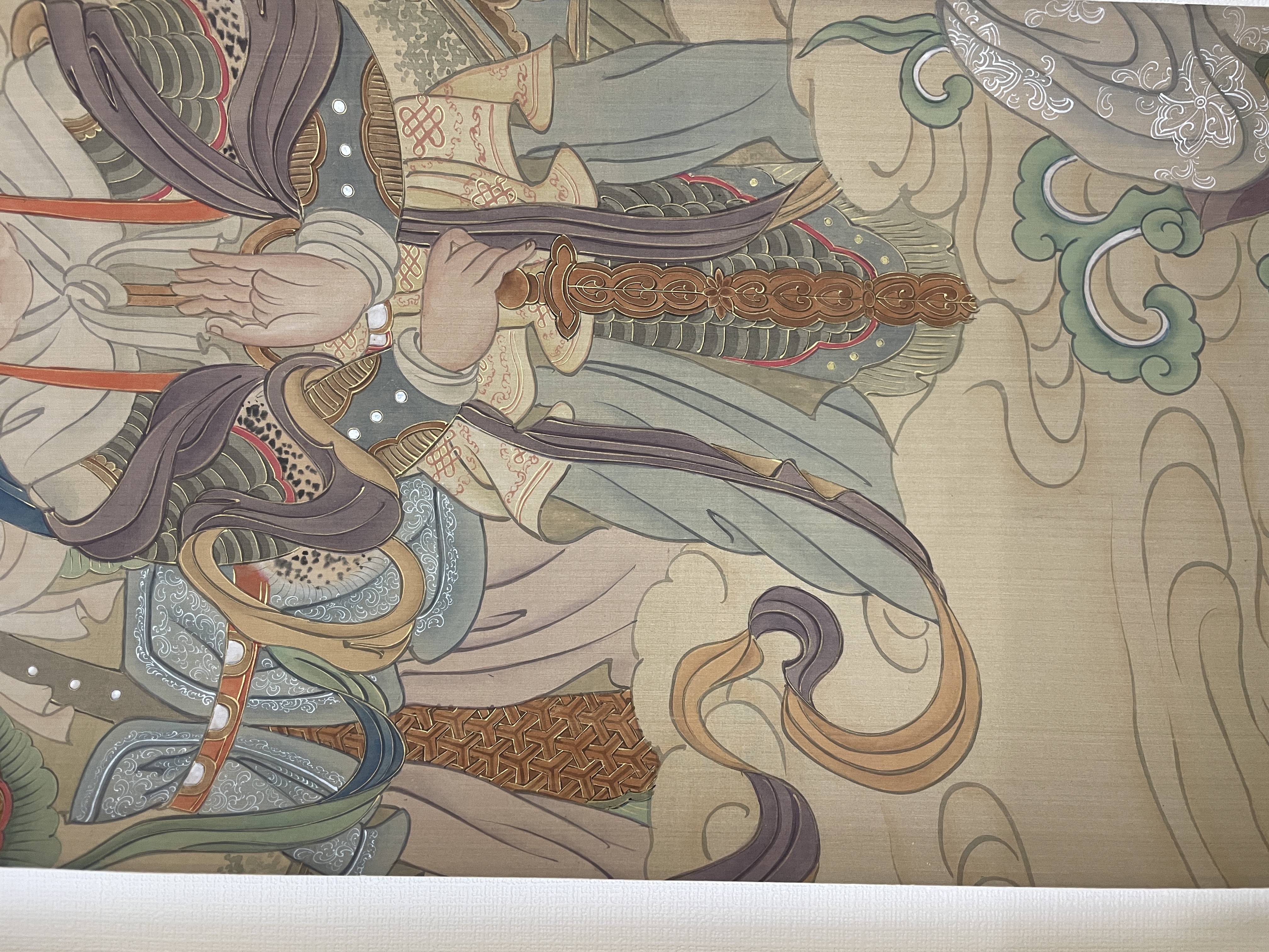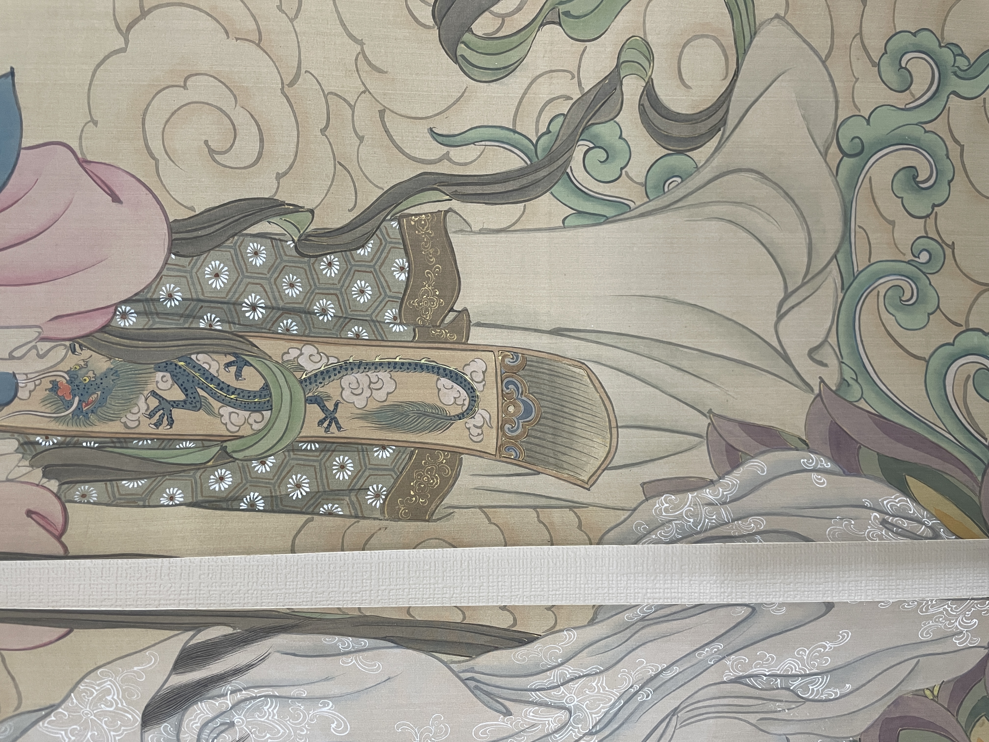 藏友您好!此套《摹敦煌观音大士通景四条屏》,绢本,无款。步月居士题签,印章“老虎”,盒签执石、少石题,印章“安圃”。画工细腻,法相庄严,整体有旧感,初鉴为清末民初佚名画家作品,喜欢可藏。图片鉴定,仅供参考。感谢您的信任与支持!