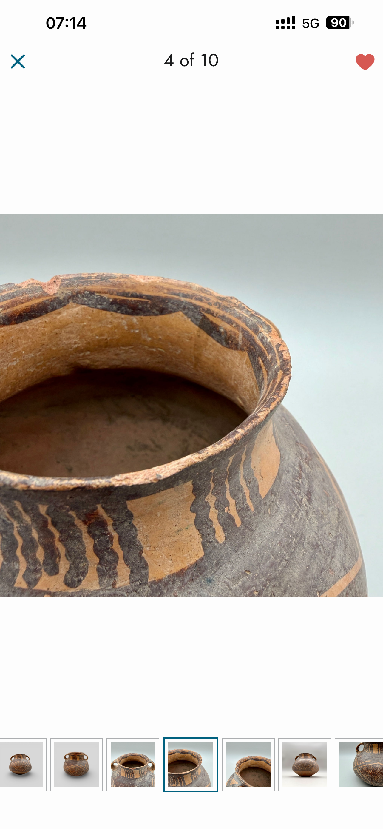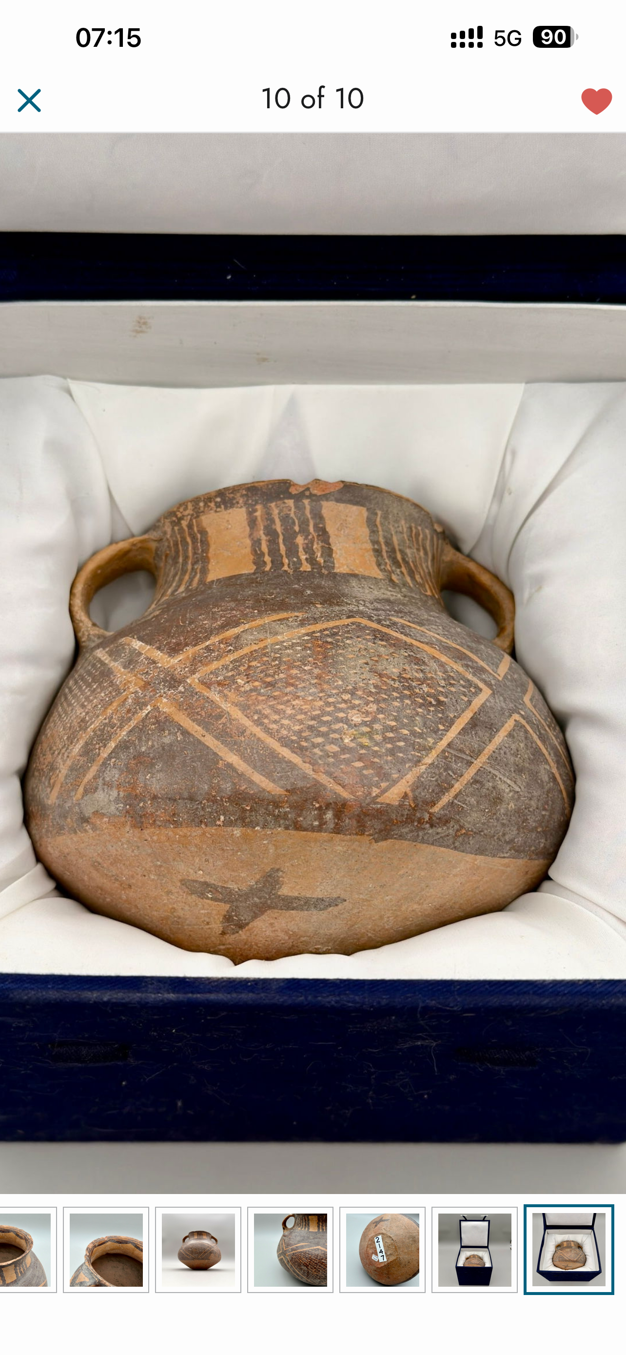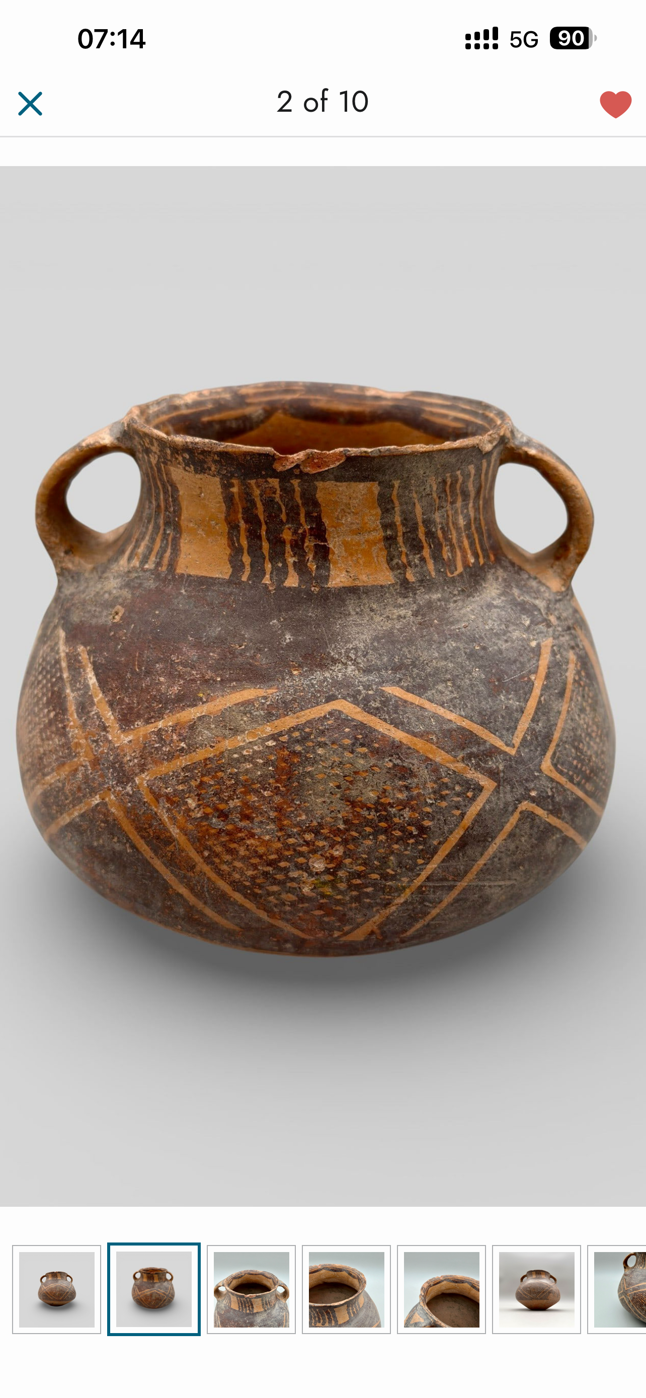 藏友您好,感谢您光临联拍鉴定。从图片来看,这件几何纹彩陶双耳罐造型古朴,施彩鲜明,纹饰富有时代风格,出土的土沁也较为自然,综合判断为马家窑时期的彩陶。不过该器物品相较差,这对其价值影响较大,建议您在购买时多加留意。以上仅为参考意见,感谢您的信任!