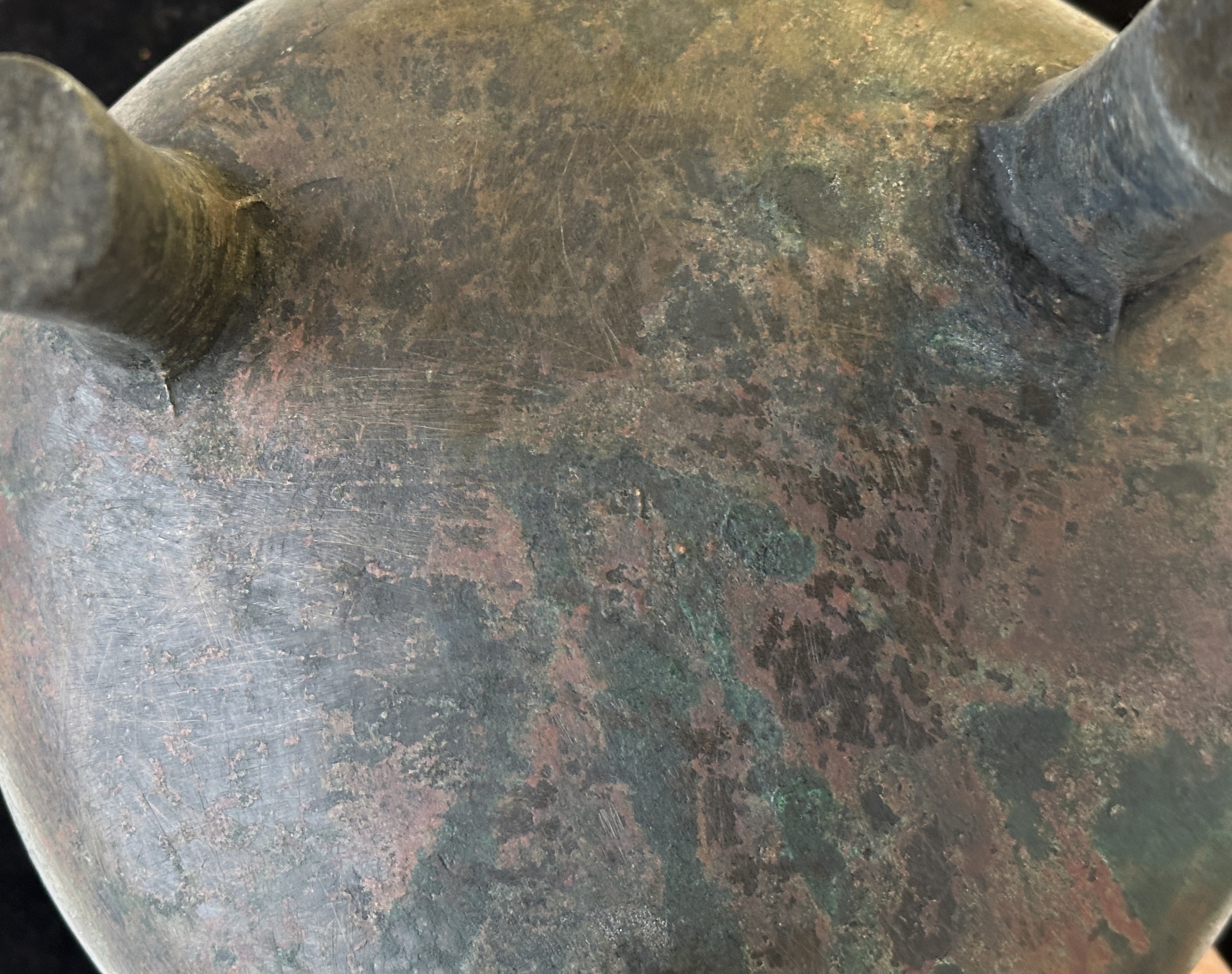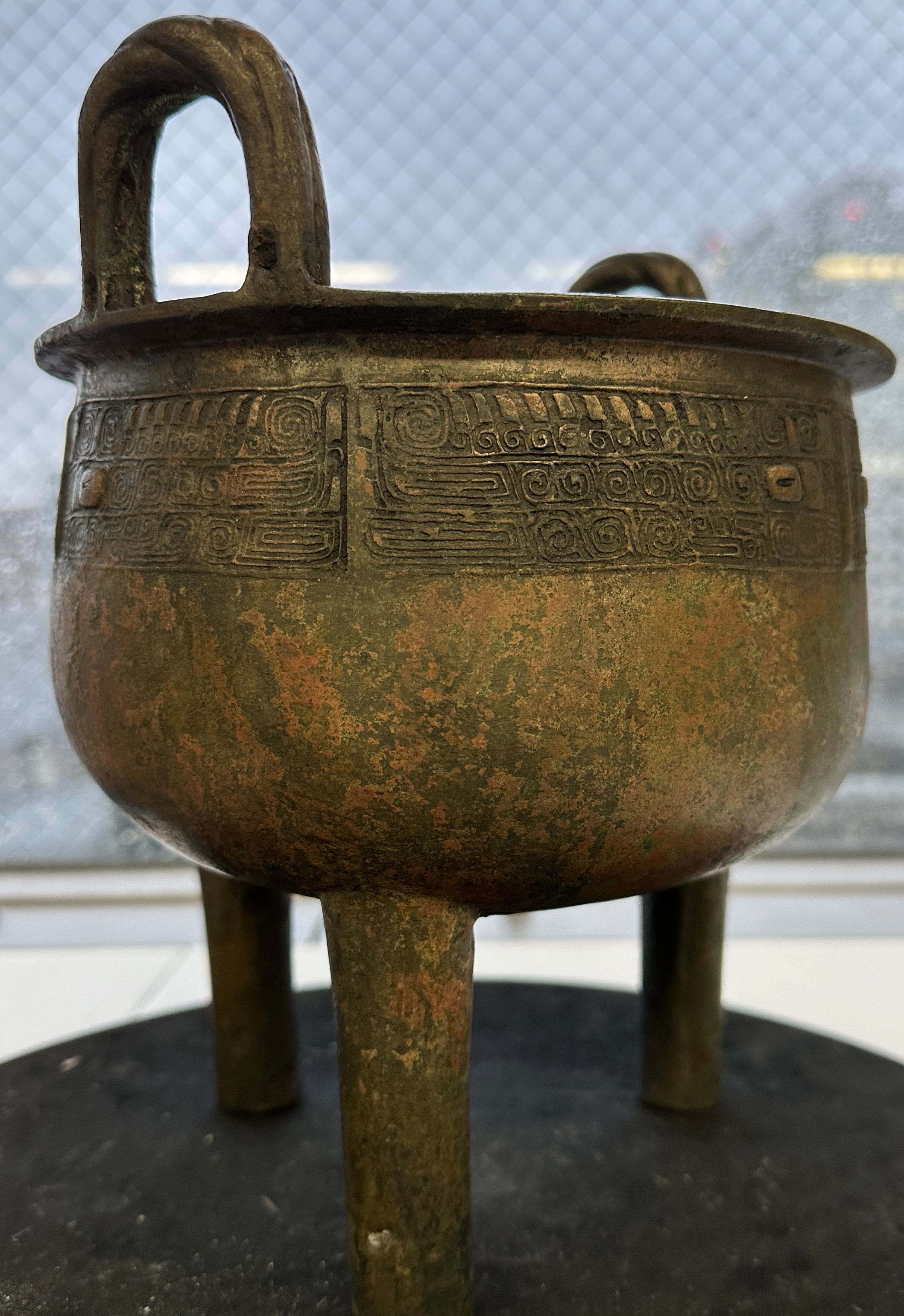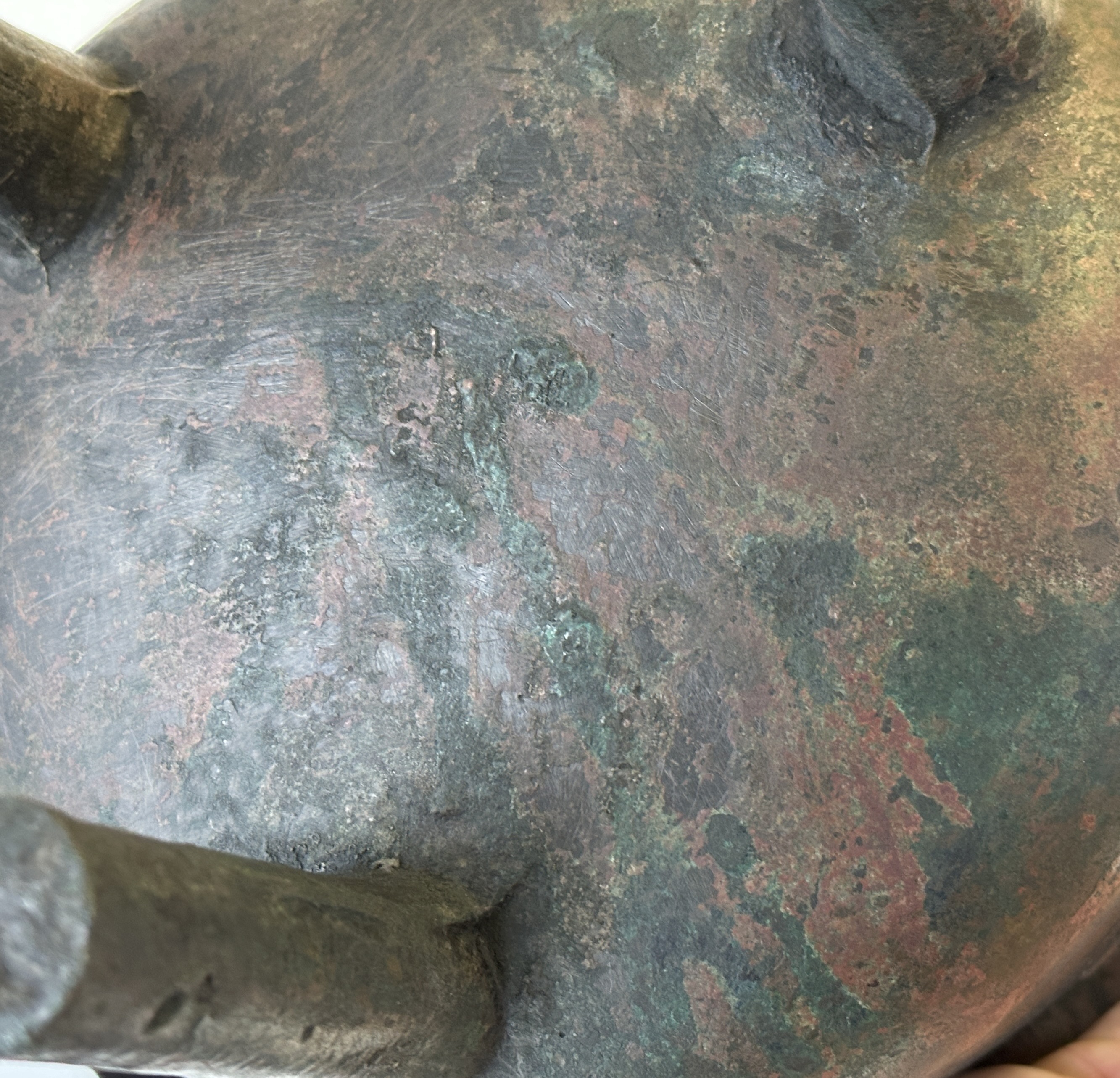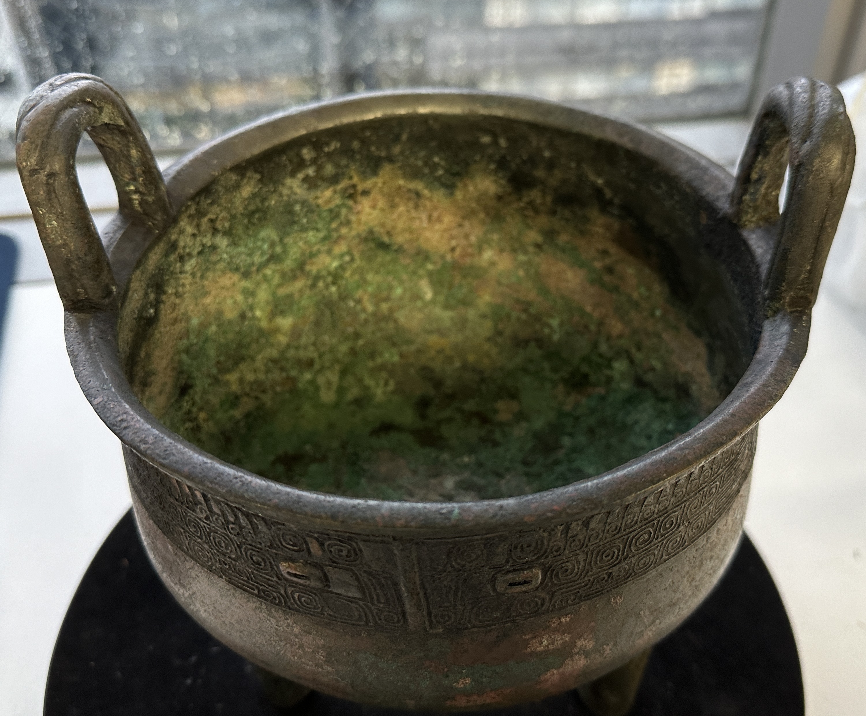 本品青铜鼎,造型及纹饰来看,为典型商晚期风格。局部锈蚀符合真品自然老化形貌特征,腿足与器身连接处的范线痕迹特征符合同时代另做底范的范铸分型方式,看为到代真品。整体是做过清理,清理得不够漂亮,显得脏黑。纹饰稍平,尺寸不大,市场价格在人民币十万左右,供参考。